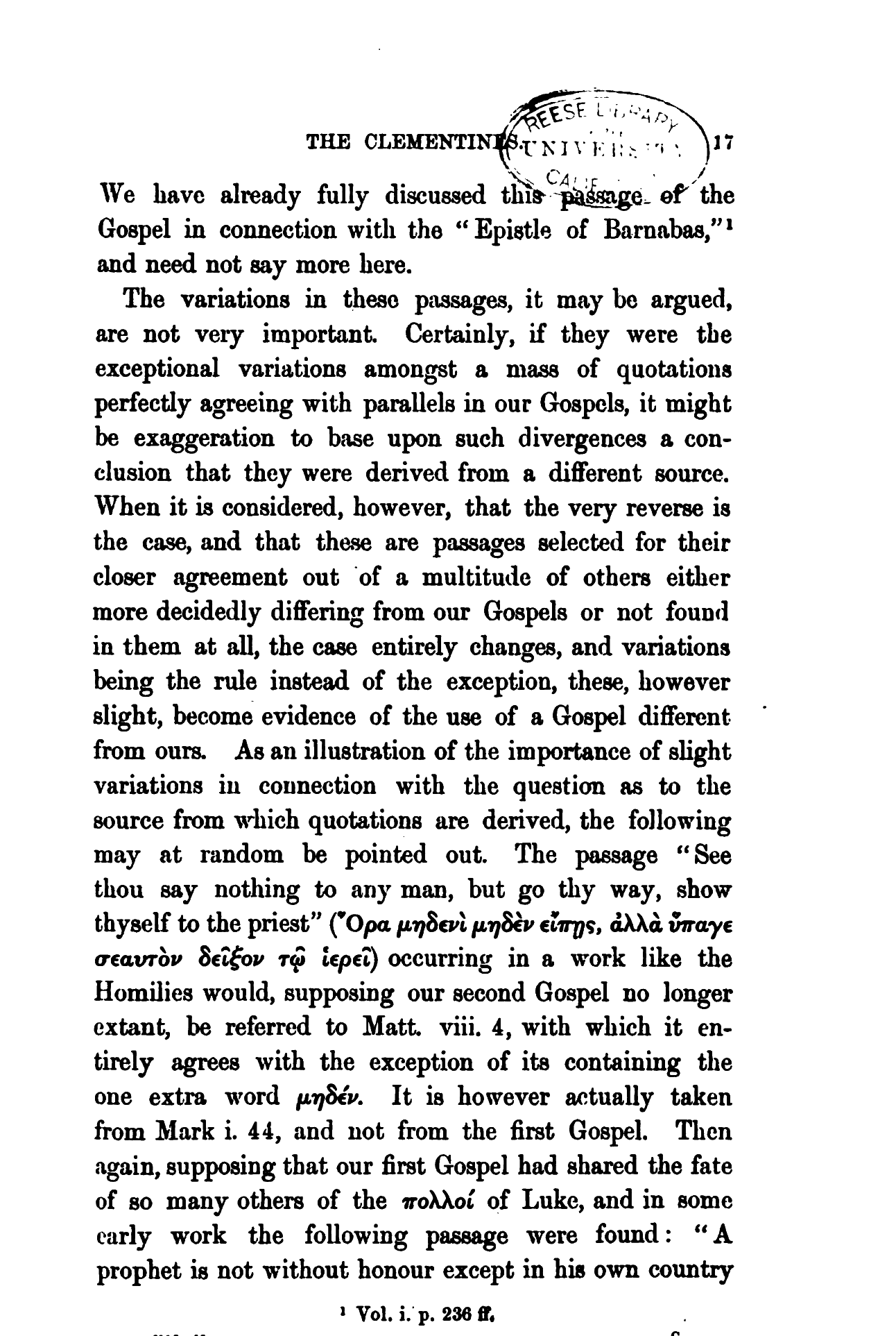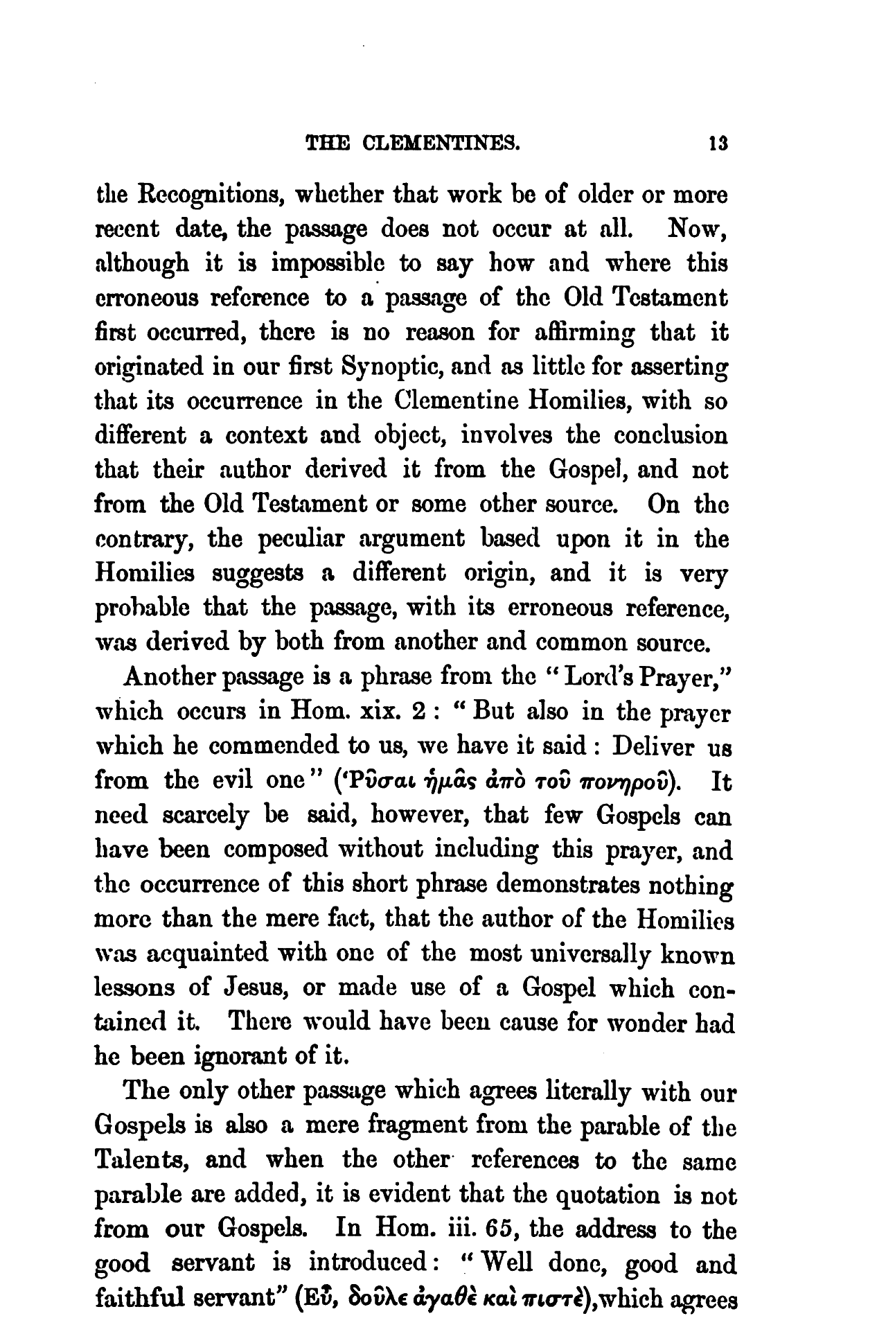 the Recognitions, whether that work be of older or more recent date, the passage does not occur at all. Now, although it is impossible to say how and where this erroneous reference to a passage of the Old Testament first occurred, there is no reason for affirming that it originated in our first Synoptic, and as little for asserting that its occurrence in the Clementine Homilies, with so different a context and object, involves the conclusion that their author derived it from the Gospel, and not from the Old Testament or some other source. On the contrary, the peculiar argument based upon it in the Homilies suggests a different origin, and it is very probable that the passage, with its erroneous reference, was derived by both from another and common source.