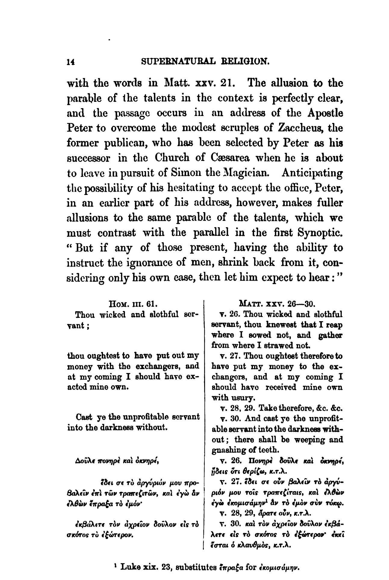 with the words in Matt. xxv. 21. The allusion to the parable of the talents in the context is perfectly clear, and the passage occurs in an address of the Apostle Peter to overcome the modest scruples of Zaccheus, the former publican, who has been selected by Peter as his successor in the Church of Caesarea when he is about to leave in pursuit of Simon the Magician. Anticipating the possibility of his hesitating to accept the office, Peter, in an earlier part of his address, however, makes fuller allusions to the same parable of the talents, which we must contrast with the parallel in the first Synoptic. "But if any of those present, having the ability to instruct the ignorance of men, shrink back from it, considering only his own ease, then let him expect to hear:"