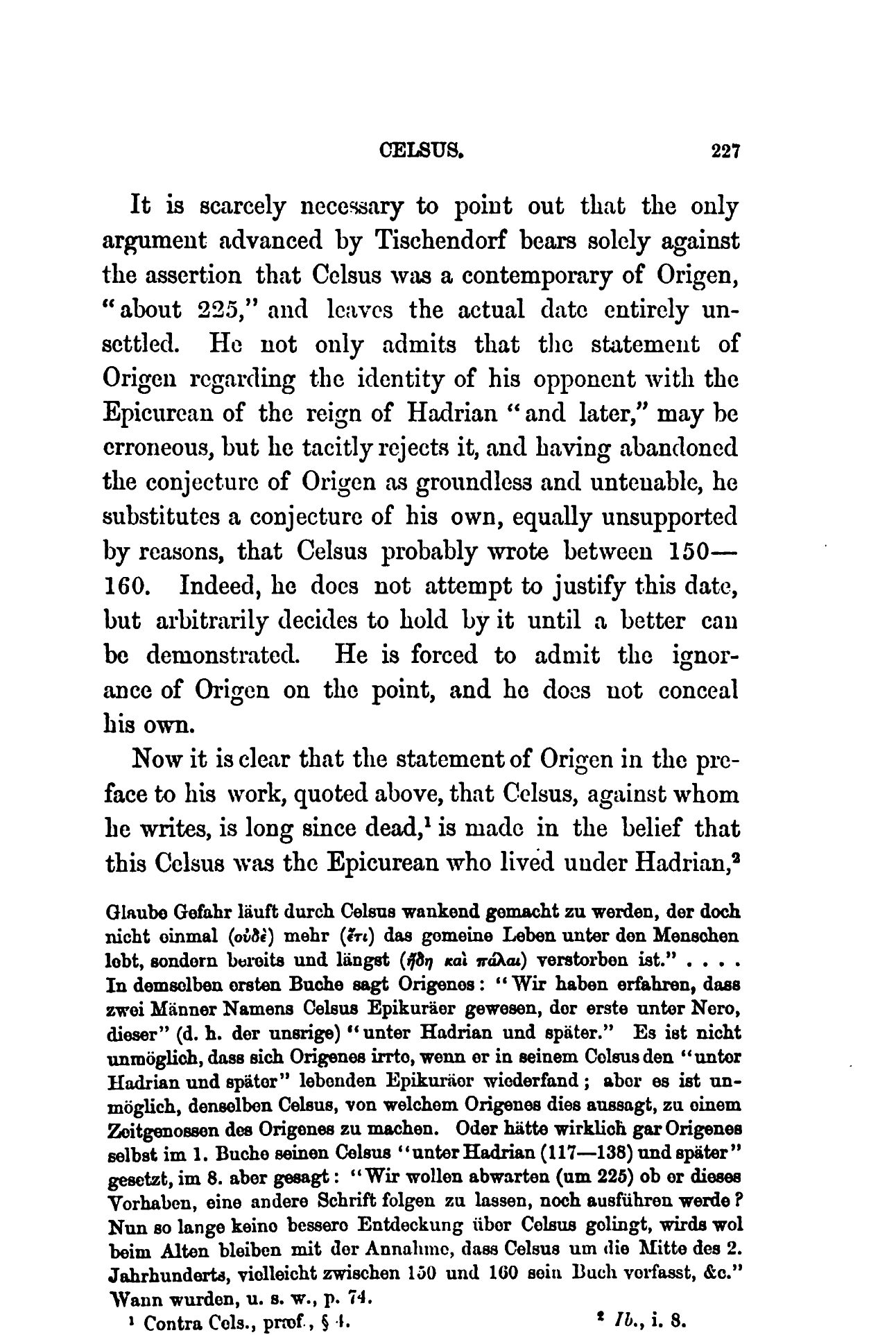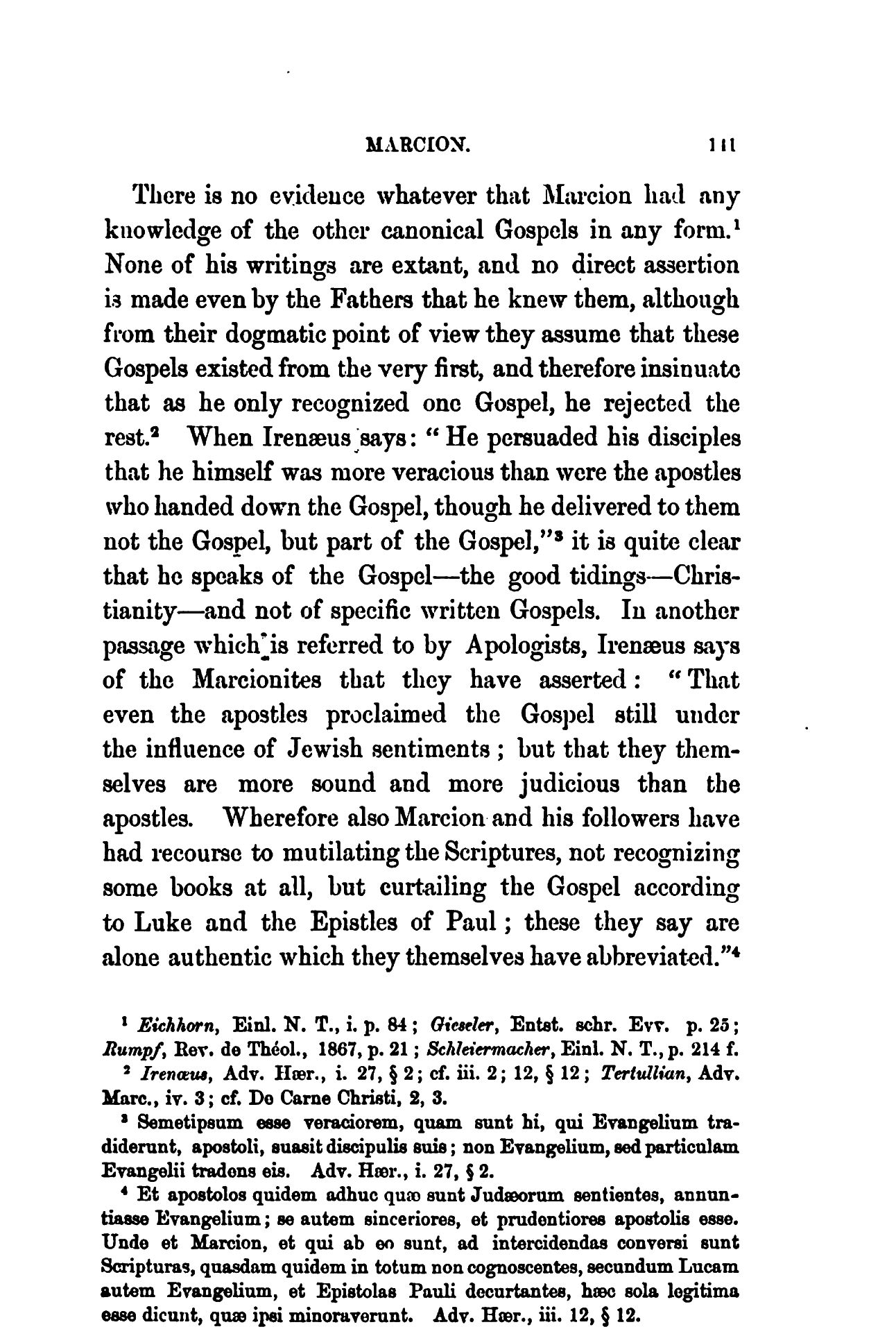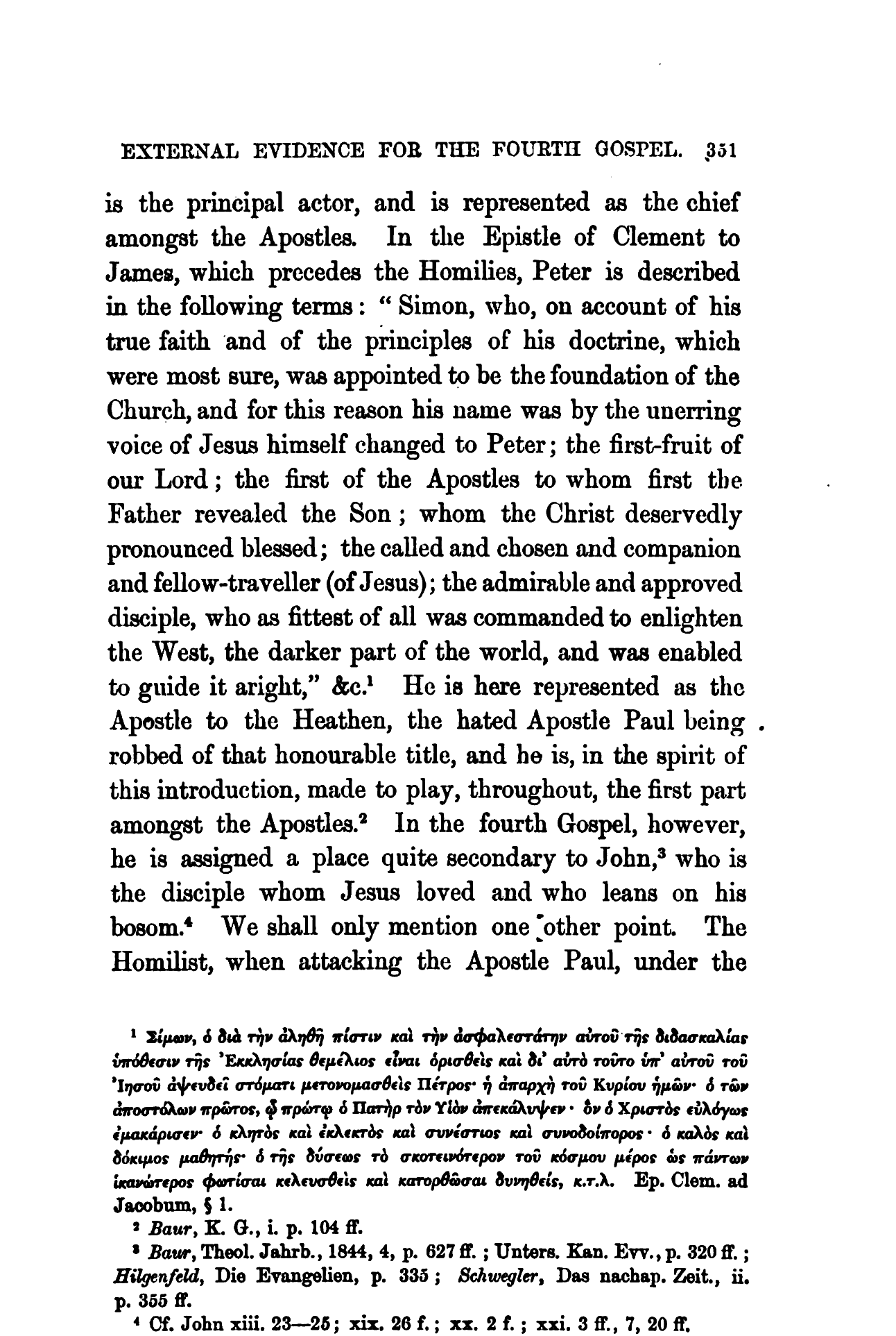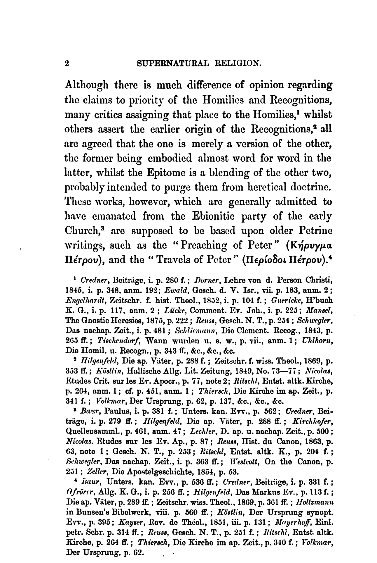 been written by the person whose name it bears. There is in fact nothing but internal evidence by which to fix the date, and that internal evidence is of a character which admits of very wide extension down the course of time, although a sharp limit is set beyond which it cannot mount upwards. Of external evidence there is almost none, and what little exists does not warrant an early date. Origen, it is true, mentions [———],(1) which, it is conjectured, may either be the same work as the [———], or Recognitions, translated by Rufinus, or related to it, and Epiphanius and others refer to [———];(2) but our Clementine Homilies are not mentioned by any writer before pseudo-Athanasius.(3) The work, therefore, can at the best afford no substantial testimony to the antiquity and apostolic origin of our Gospels. Hilgenfeld, following in the steps of Baur, arrives at the conclusion that the Homilies are directed against the Gnosticism of Marcion (and also, as we shall hereafter see, against the Apostle Paul), and he, therefore, necessarily assigns to them a date subsequent to a.d. 160. As Reuss, however, inquires: upon this ground, why should a still later date not be named, since even Tertullian wrote vehemently against the same Gnosis.(4) There can be little doubt that the author was a representative of Ebionitic Gnosticism, which had once been the purest form of primitive Christianity, but later, through its own development, though still more through the rapid growth around it of Paulinian doctrine, had