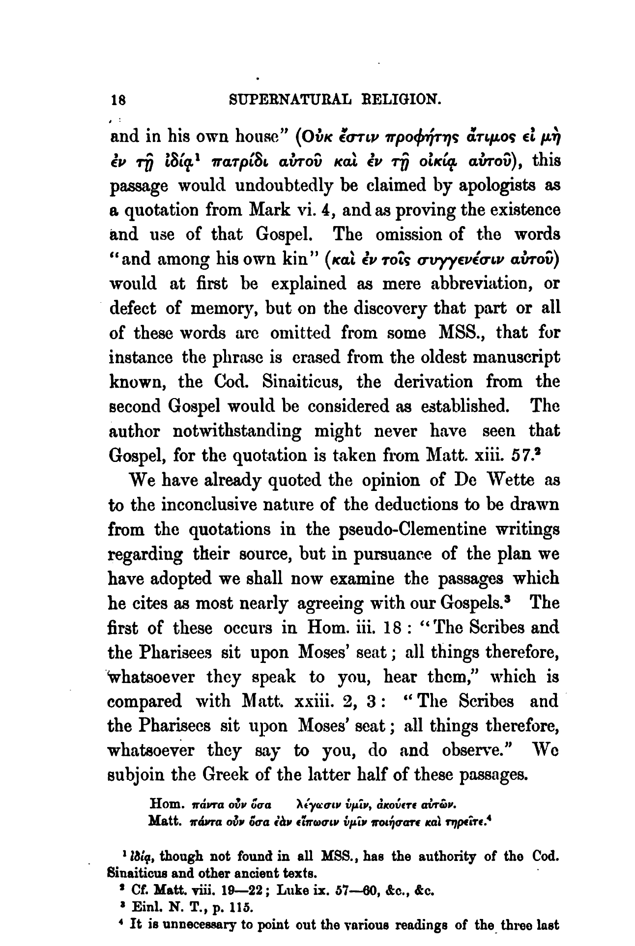 We have already quoted the opinion of De Wette as to the inconclusive nature of the deductions to be drawn from the quotations in the pseudo-Clementine writings regarding their source, but in pursuance of the plan we have adopted we shall now examine the passages which he cites as most nearly agreeing with our Gospels.(3) The first of these occurs in Hom. iii. 18: "The Scribes and the Pharisees sit upon Moses' seat; all things therefore, whatsoever they speak to you, hear them," which is compared with Matt, xxiii. 2, 3: "The Scribes and the Pharisees sit upon Moses' seat; all things therefore, whatsoever they say to you, do and observe." We subjoin the Greek of the latter half of these passages.