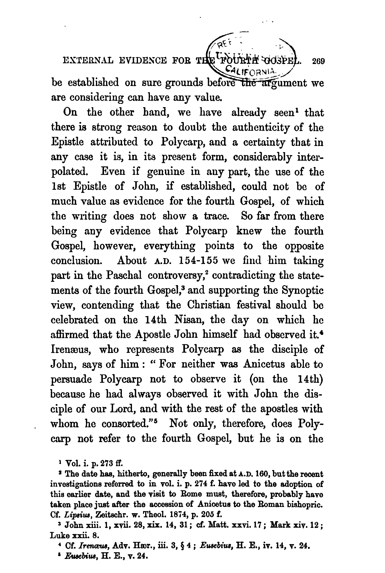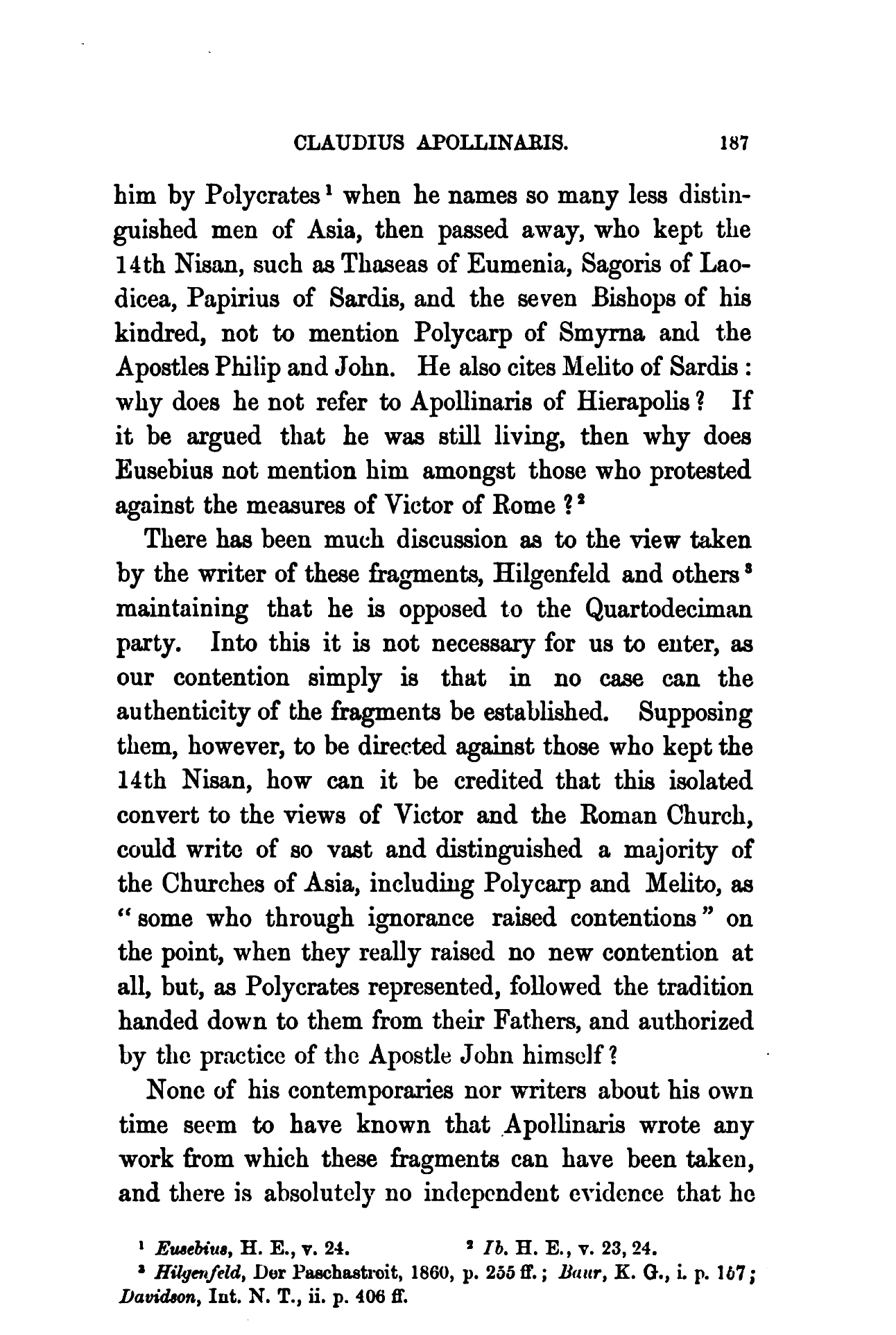 second half of the second century a violent discussion arose as to the day upon which "the true Passover of the Lord" should be celebrated, the Church in Asia Minor maintaining that it should be observed on the 14th Nisan,—the day on which, according to the Synoptics, Jesus himself celebrated the Passover and instituted the Christian festival,—whilst the Roman Church as well as most other Christians,—following the fourth Gospel, which represents Jesus as not celebrating the last Passover, but being himself slain upon the 14th Nisan, the true Paschal lamb,—had abandoned the day of the Jewish feast altogether, and celebrated the Christian festival on Easter Sunday, upon which the Resurrection was supposed to have taken place. Polycarp, who went to Rome to represent the Churches of Asia Minor in the discussions upon the subject, could not be induced to give up the celebration on the 14th Nisan, the day which, according to tradition, had always been observed, and he appealed to the practice of the Apostle John himself in support of that date. Eusebius quotes from Irenæus the statement of the case: "For neither could Anicetus persuade Polycarp not to observe it (the 14th Nisan), because he had ever observed it with John the disciple of our Lord, and with the rest of the Apostles with whom he consorted."(1) Towards the end of the century, Polycrates, the Bishop of Ephesus, likewise appeals to the practice of "John who reclined upon the bosom of the Lord," as well as of the Apostle Philip and his daughters, and of Polycarp and others in support of the same day: "All these observed