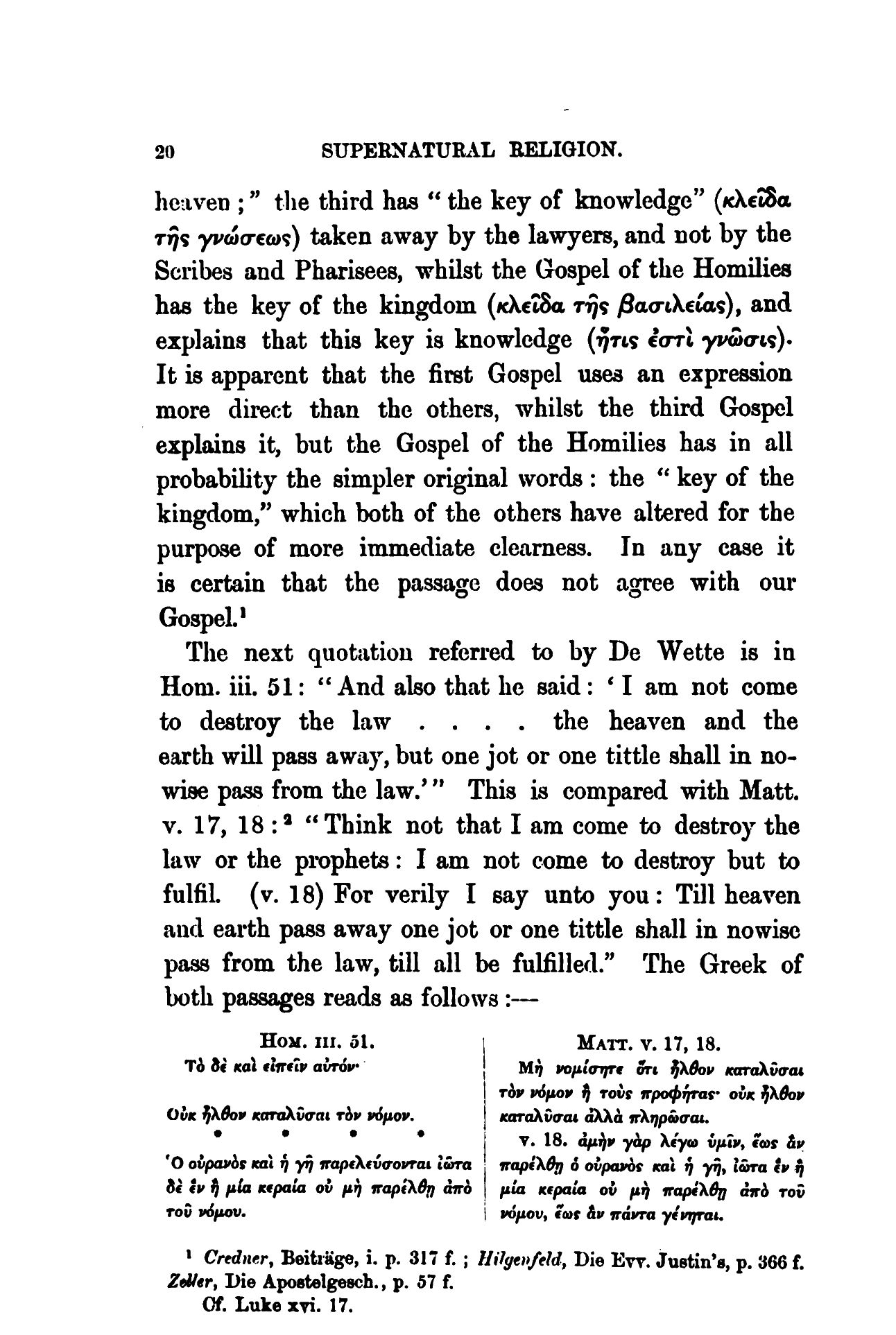 The next quotation referred to by De Wette is in Hom. iii. 51: "And also that he said: 'I am not come to destroy the law.... the heaven and the earth will pass away, but one jot or one tittle shall in nowise pass from the law.'" This is compared with Matt. v. 17, 18:(2) "Think not that I am come to destroy the law or the prophets: I am not come to destroy but to fulfil, (v. 18) For verily I say unto you: Till heaven and earth pass away one jot or one tittle shall in nowise pass from the law, till all be fulfilled." The Greek of both passages reads as follows:—