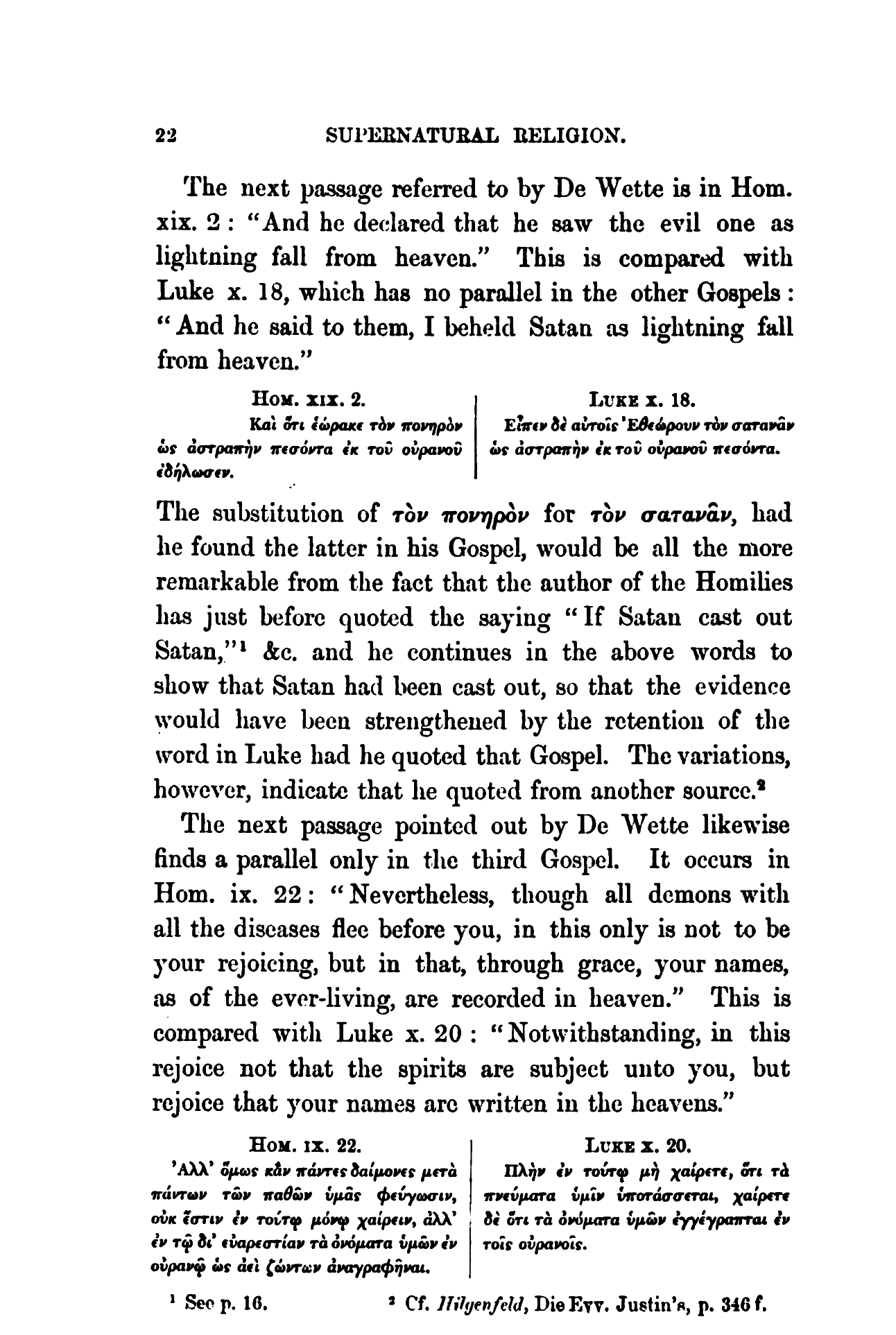 The next passage referred to by De Wette is in Hom. xix. 2: "And he declared that he saw the evil one as lightning fall from heaven." This is compared with Luke x. 18, which has no parallel in the other Gospels: "And he said to them, I beheld Satan as lightning fall from heaven."