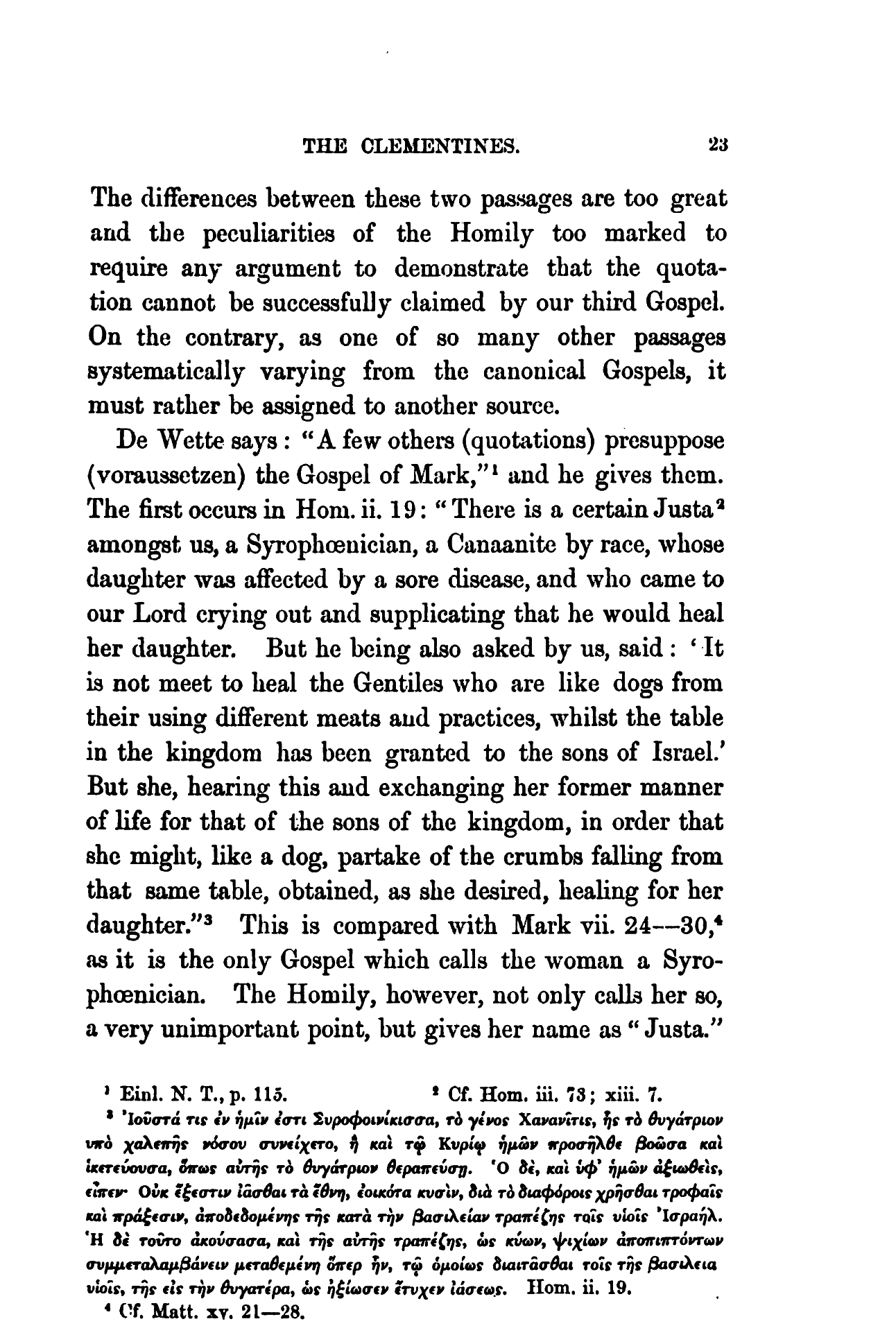 De Wette says: "A few others (quotations) presuppose (voraussetzen) the Gospel of Mark,"(1) and he gives them. The first occurs in Hom. ii. 19: "There is a certain Justa(2) amongst us, a Syrophoenician, a Canaantte by race, whose daughter was affected by a sore disease, and who came to our Lord crying out and supplicating that he would heal her daughter. But he being also asked by us, said: 'It is not meet to heal the Gentiles who are like dogs from their using different meats and practices, whilst the table in the kingdom has been granted to the sons of Israel.' But she, hearing this and exchanging her former manner of life for that of the sons of the kingdom, in order that she might, like a dog, partake of the crumbs falling from that same table, obtained, as she desired, healing for her daughter."(3) This is compared with Mark vii. 24—30,(4) as it is the only Gospel which calls the woman a Syrophoenician. The Homily, however, not only calls her so, a very unimportant point, but gives her name as "Justa."