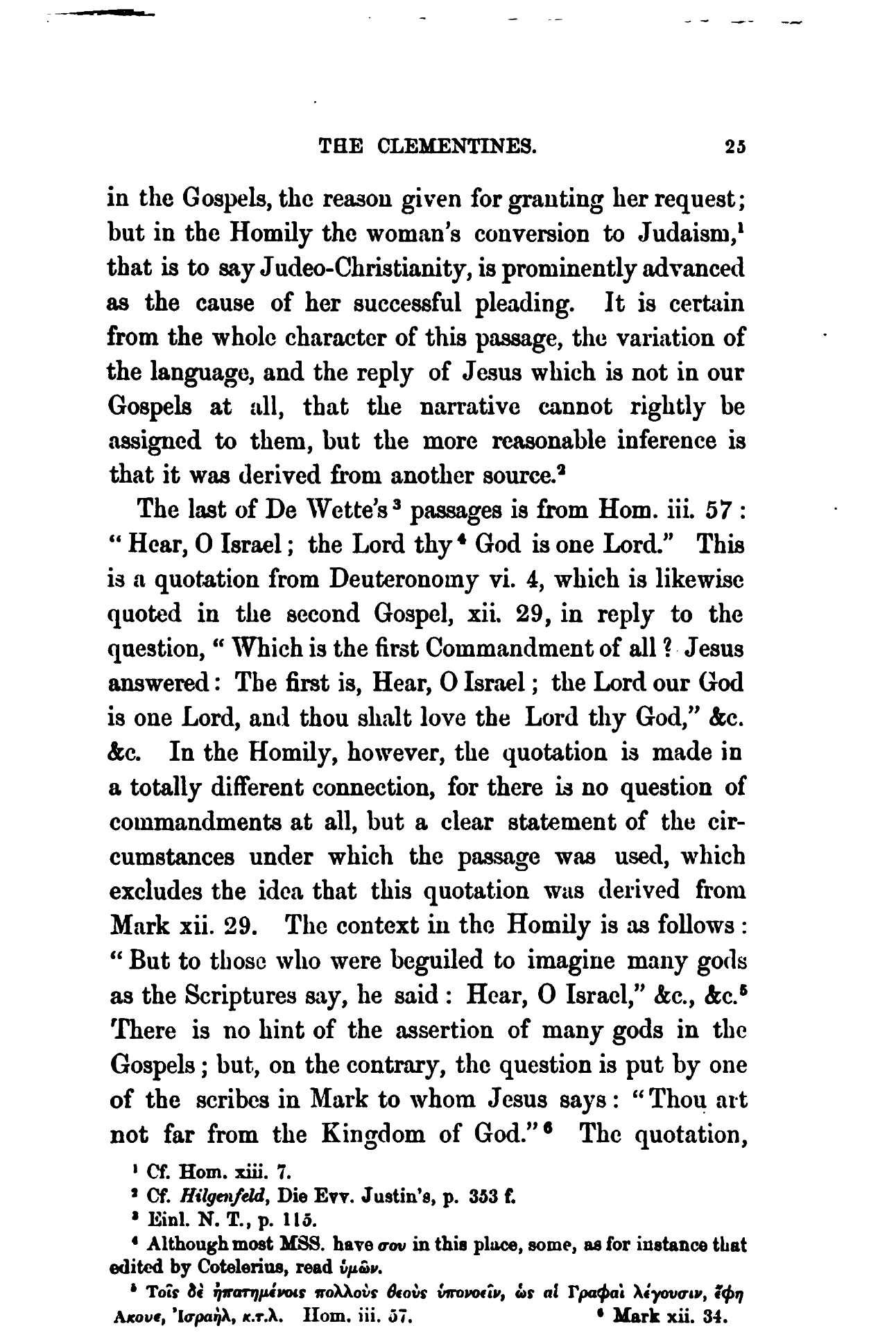 The last of De Wette's(3) passages is from Hom. iii. 57: "Hear, O Israel; the Lord thy(4) God is one Lord." This is a quotation from Deuteronomy vi. 4, which is likewise quoted in the second Gospel, xii. 29, in reply to the question, "Which is the first Commandment of all? Jesus answered: The first is, Hear, O Israel; the Lord our God is one Lord, and thou shalt love the Lord thy God," &c. &c. In the Homily, however, the quotation is made in a totally different connection, for there is no question of commandments at all, but a clear statement of the circumstances under which the passage was used, which excludes the idea that this quotation was derived from Mark xii. 29. The context in the Homily is as follows: "But to those who were beguiled to imagine many gods as the Scriptures say, he said: Hear, O Israel," &c, &c.(5) There is no hint of the assertion of many gods in the Gospels; but, on the contrary, the question is put by one of the scribes in Mark to whom Jesus says: "Thou art not far from the Kingdom of God."6 The quotation,