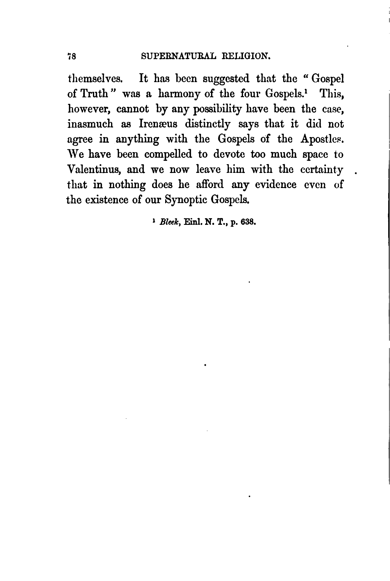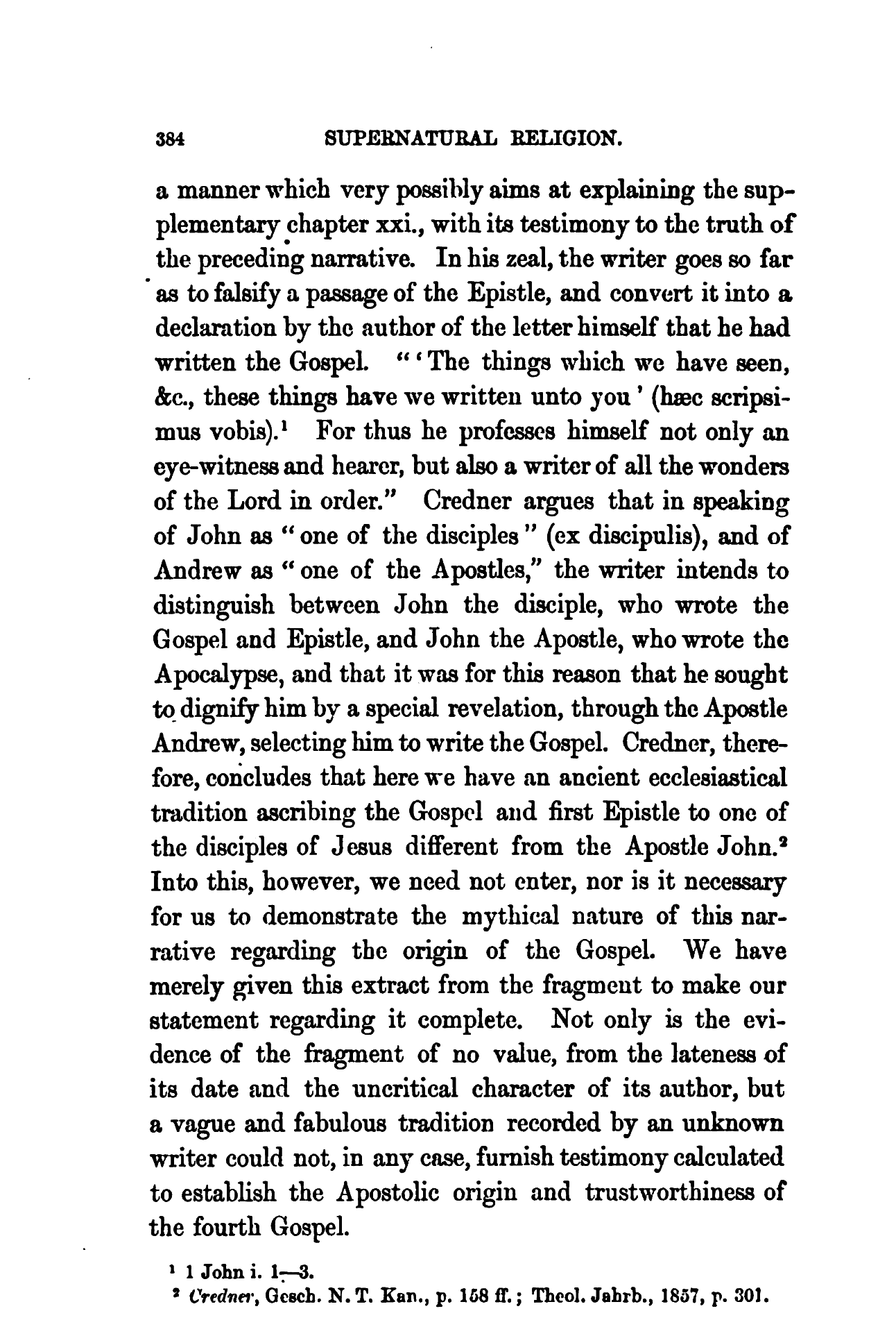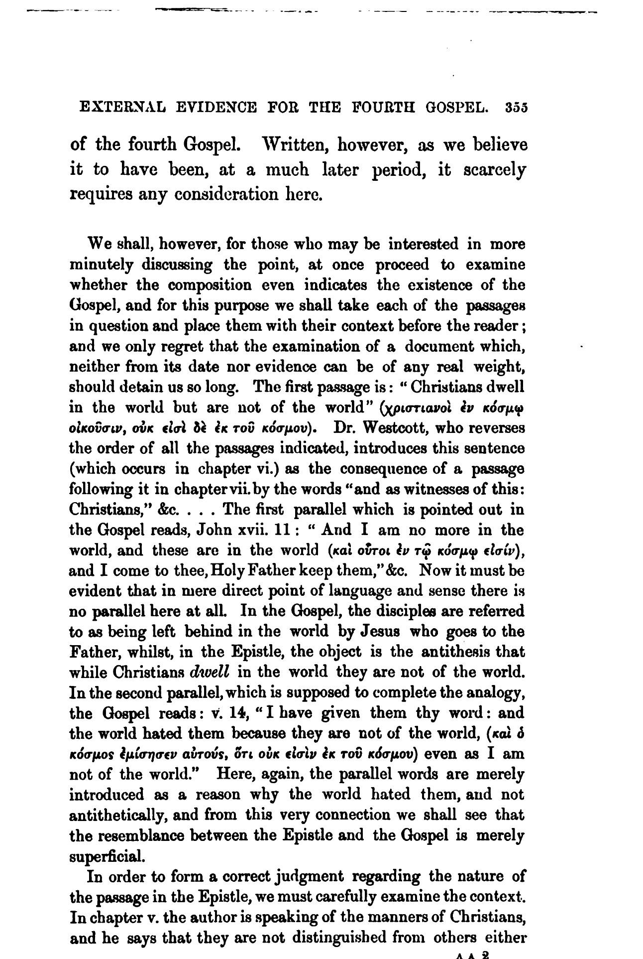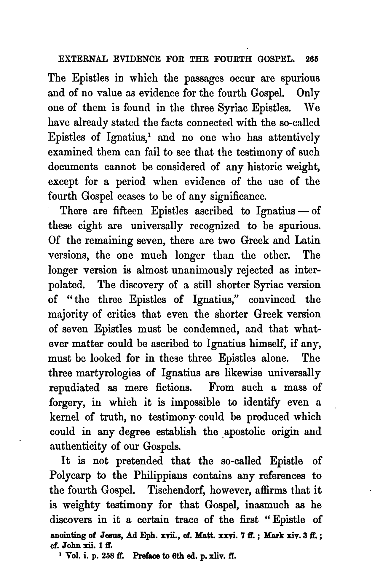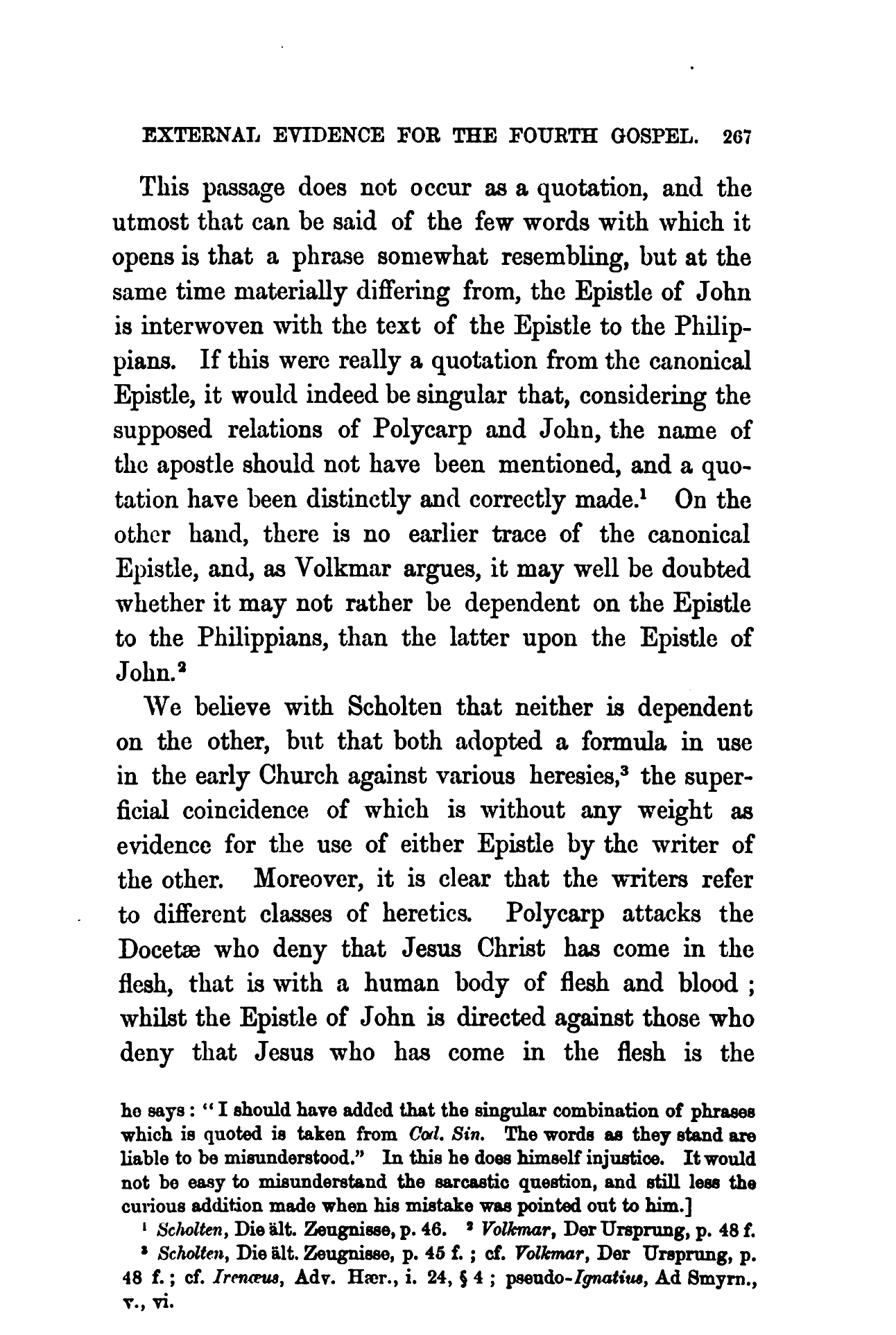 The elaborate explanations by which the phenomena of the fourth Gospel are reconciled with the assumption that it was composed by the Apostle John are in vain, and there is not a single item of evidence within the first century and a half which does not agree with internal testimony in opposing the supposition. To one point, however, we must briefly refer in connection with this statement. It is asserted that the Gospel and Epistles—or at least the first Epistle—of the Canon ascribed to the Apostle John are by one author, although this is not without contradiction,(1) and very many of those who agree as to the identity of authorship by no means admit the author to have been the Apostle John. It is argued, therefore, that the use of the Epistle by Polycarp and Papias is evidence of the apostolic origin of the Gospel. We have, however, seen, that not only is it very uncertain that Polycarp made use of the Epistle at all, but that he does not in any case mention its author's name. There is not a particle of evidence that he ascribed the Epistle, even supposing he knew it, to the