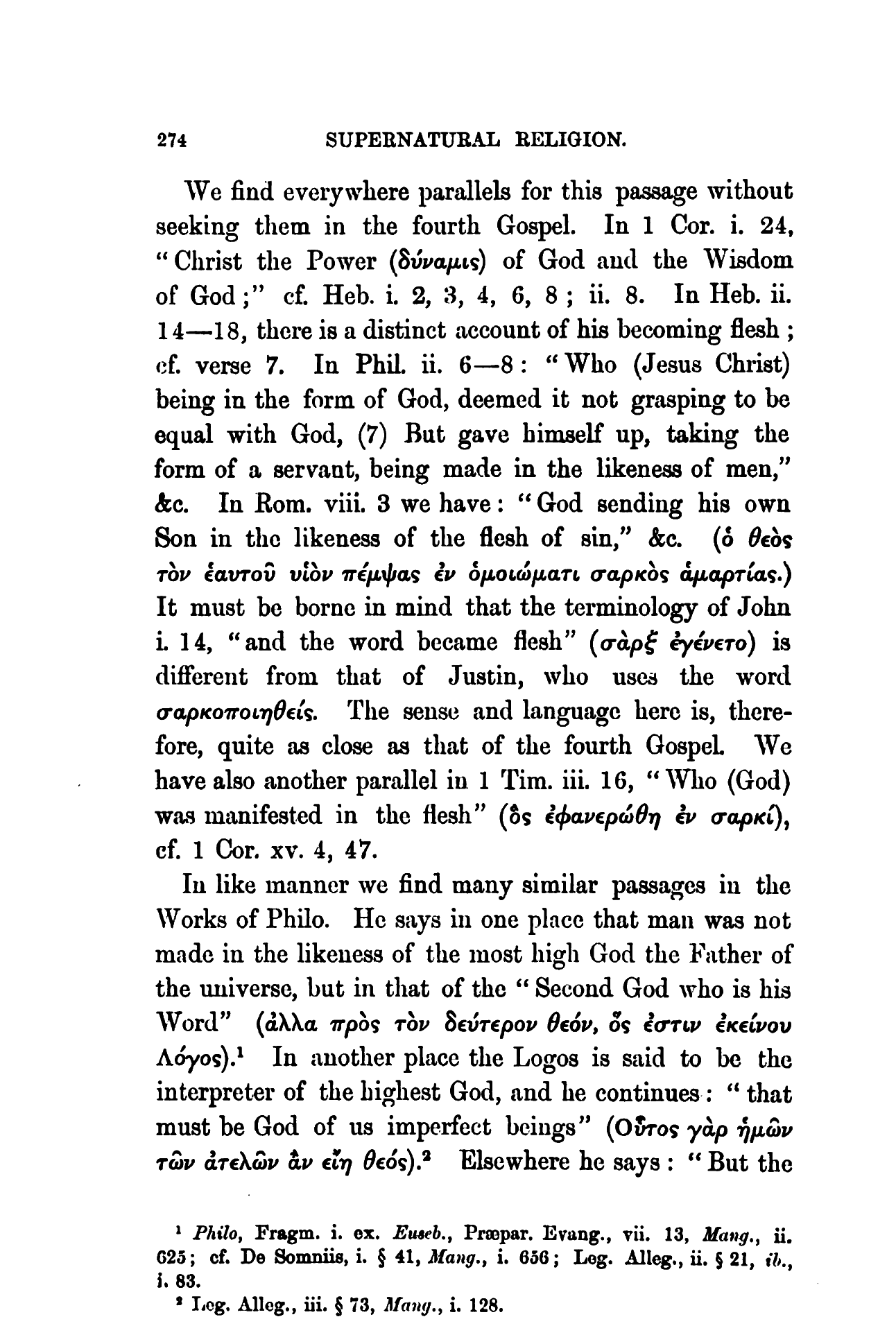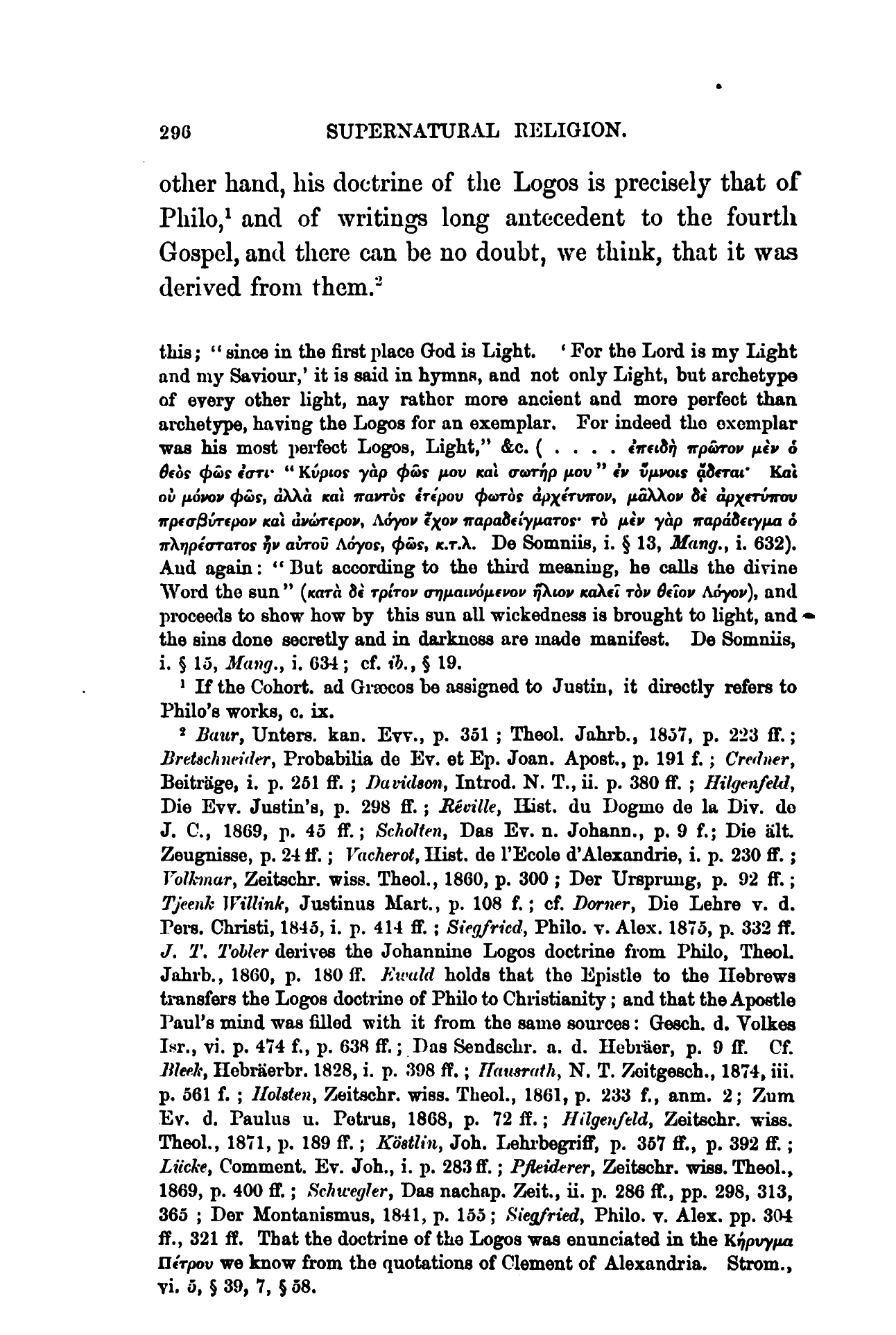 when the events which he relates really happened, and the time of the composition of his book,—space enough certainly to make a few mistakes conceivable, even presupposing a good memory and unshaken love of truth. Let us imagine, for instance, that to-day (in 1841) an old man of eighty to ninety years of age should write down from mere memory the occurrences of the American War (of Independence), in which he himself in his early youth played a part. Certainly in his narrative, even though it might otherwise be true, many traits would be found which would not agree with the original event. Moreover, another particular circumstance must be added in connection with the fourth Gospel. Two-thirds of it consist of discourses, which John places in the mouth of Jesus Christ. Now every day's experience proves that oral impressions are much more fleeting than those of sight. The happiest memory scarcely retains long orations after three or four years: how, then, could John with verbal accuracy report the discourses of Jesus after fifty or sixty years! We must be content if he truly render the chief contents and spirit of them, and that he does this, as a rule, can be proved. It has been shown above that already, before Christ, a very peculiar philosophy of religion had been formed among the Egyptian Jews, which found its way into Palestine through the Essenes, and also numbered numerous adherents amongst the Jews of the adjacent countries of Syria and Asia Minor. The Apostle Paul professed this: not less the Evangelist John. Undoubtedly, the latter allowed this Theosophy to exercise a strong influence upon his representation of the life-history of Jesus,"(1) &c.