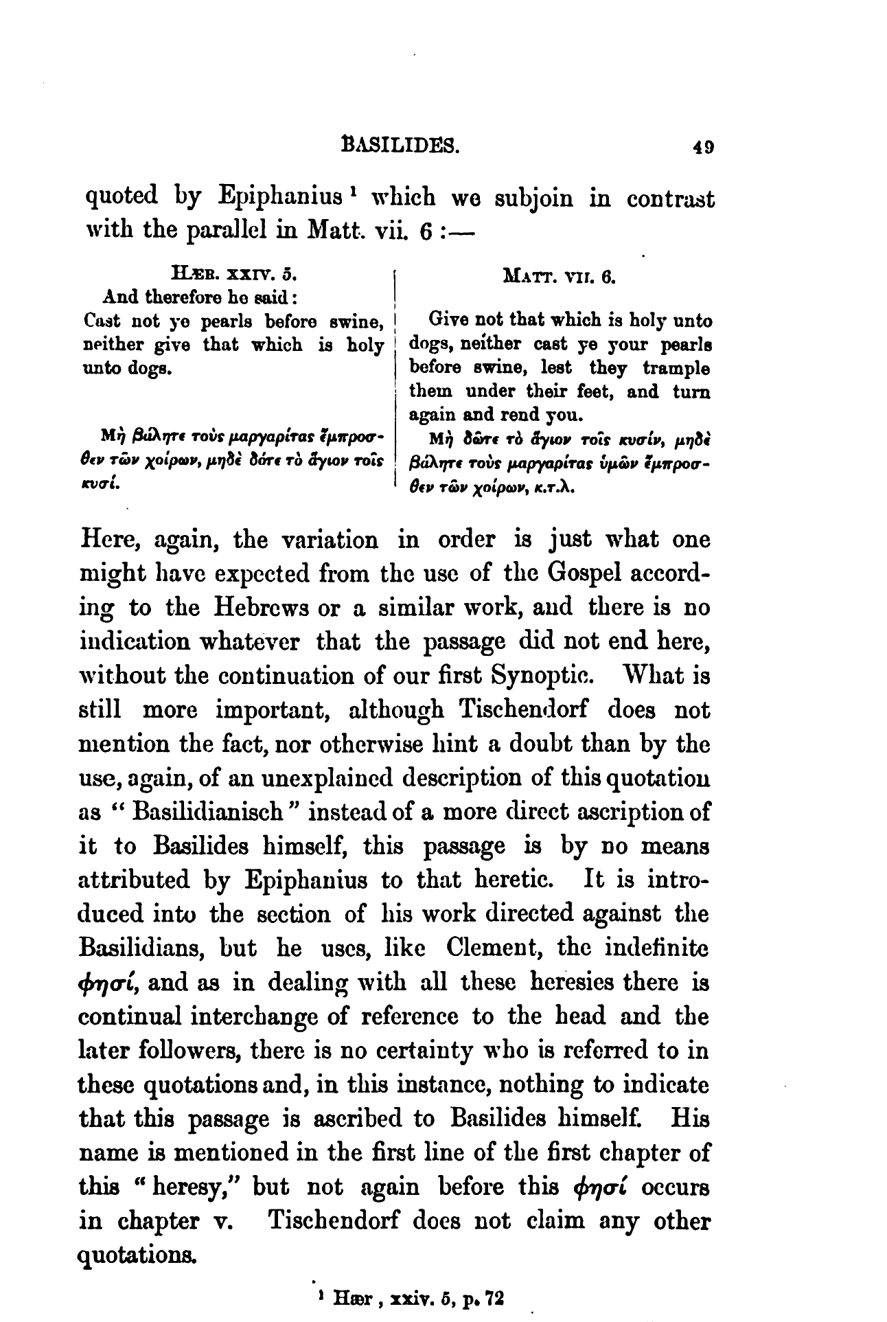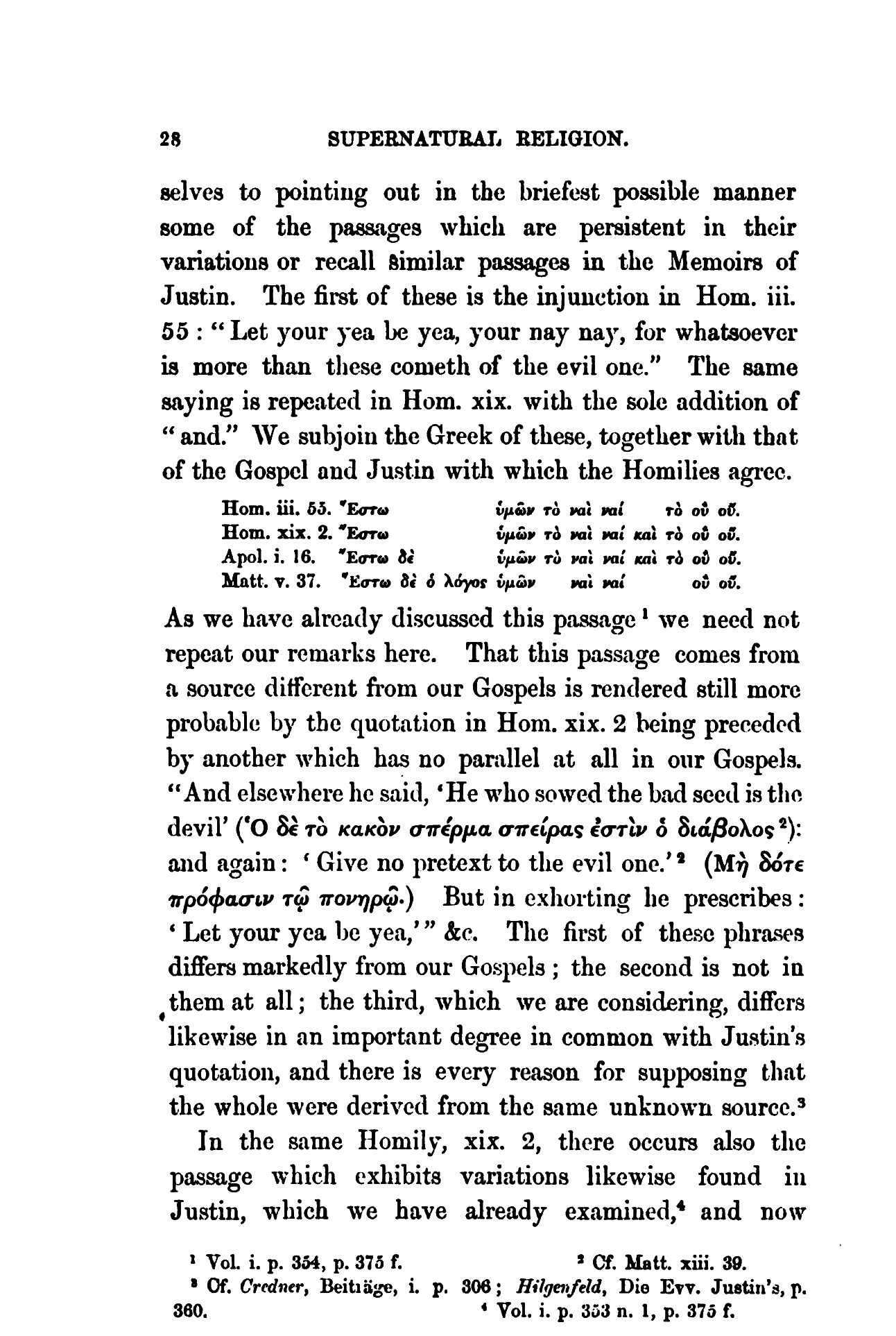 As we have already discussed this passage(1) we need not repeat our remarks here. That this passage comes from a source different from our Gospels is rendered still more probable by the quotation in Hom. xix. 2 being preceded by another which has no parallel at all in our Gospels. "And elsewhere he said, 'He who sowed the bad seed is the devil' [———](2): and again: 'Give no pretext to the evil one.'(2) [———]. But in exhorting he prescribes: 'Let your yea be yea.'" &c. The first of these phrases differs markedly from our Gospels; the second is not in them at all; the third, which we are considering, differs likewise in an important degree in common with Justin's quotation, and there is every reason for supposing that the whole were derived from the same unknown source.(3) In the same Homily, xix. 2, there occurs also the passage which exhibits variations likewise found in Justin, which we have already examined,(4) and now