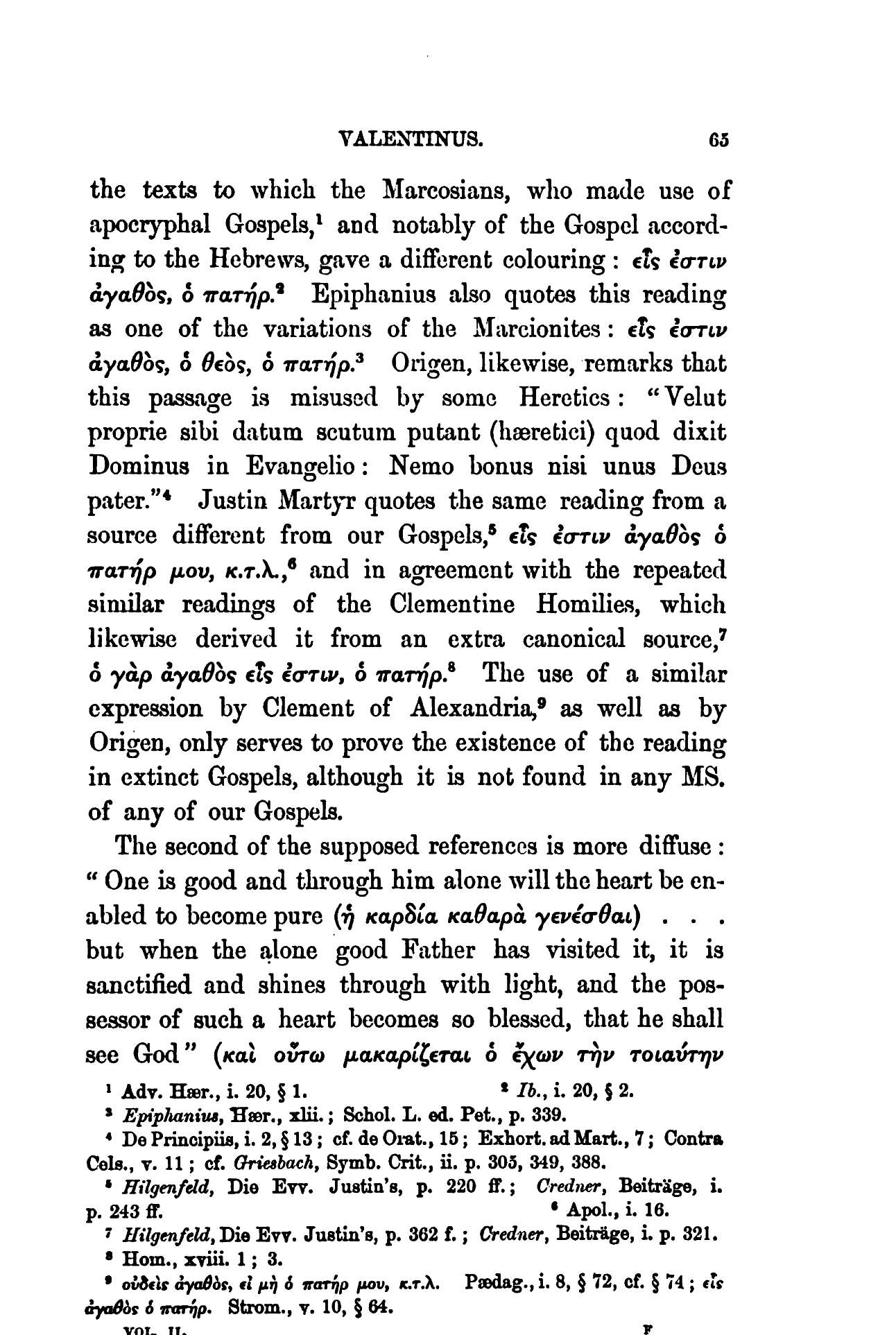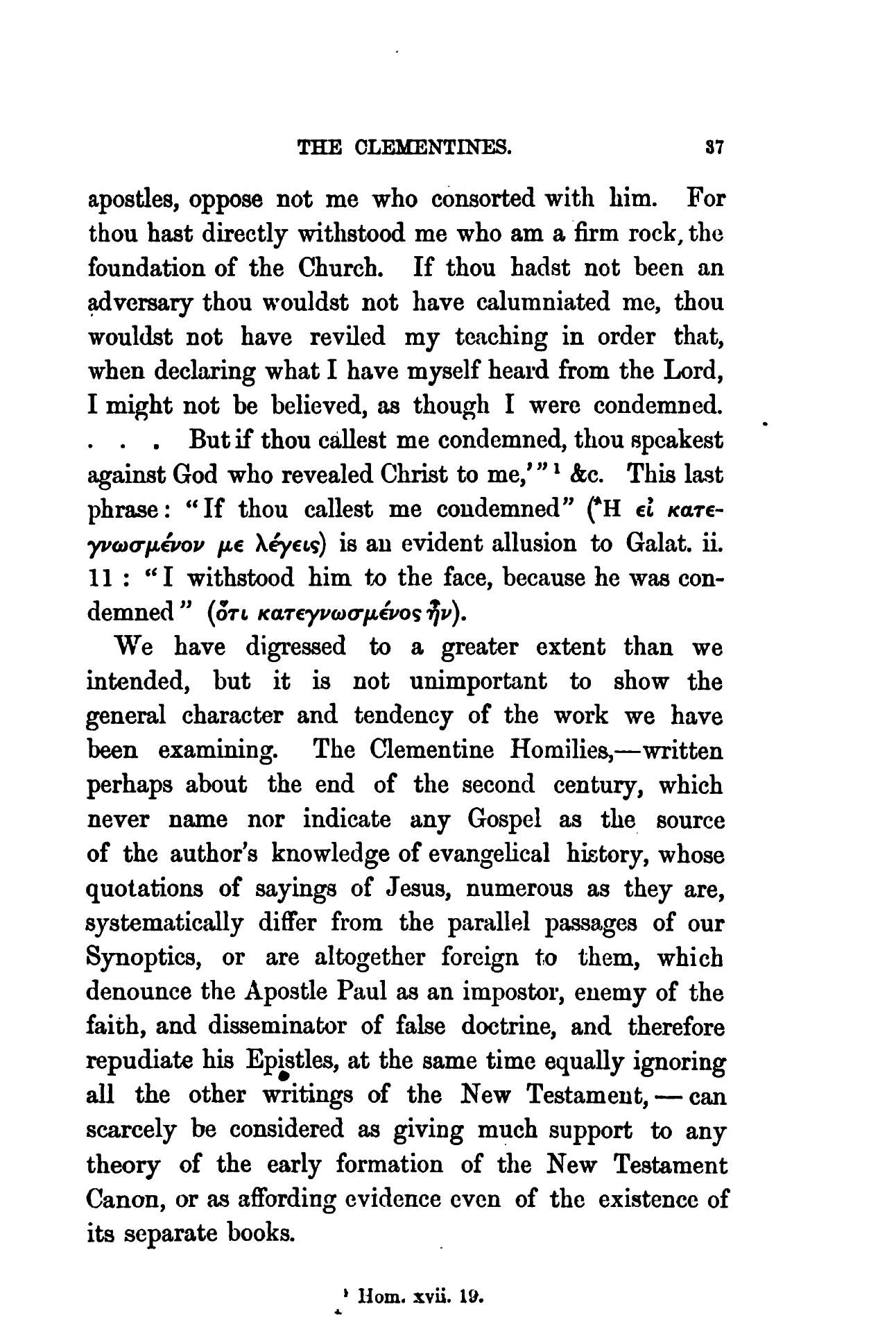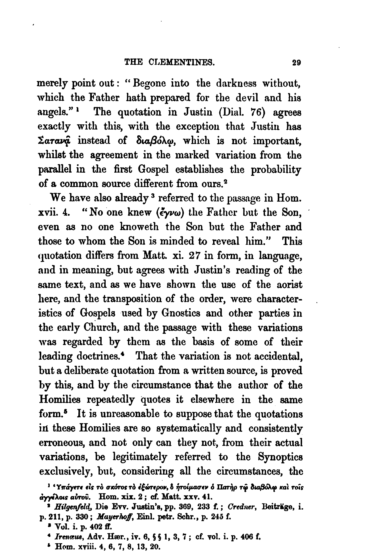 We have also already(3) referred to the passage in Hom. xvii. 4. "No one knew [———] the Father but the Son, even as no one knoweth the Son but the Father and those to whom the Son is minded to reveal him." This quotation differs from Matt. xi. 27 in form, in language, and in meaning, but agrees with Justin's reading of the same text, and as we have shown the use of the aorist here, and the transposition of the order, were characteristics of Gospels used by Gnostics and other parties in the early Church, and the passage with these variations was regarded by them as the basis of some of their leading doctrines.(4) That the variation is not accidental, but a deliberate quotation from a written source, is proved by this, and by the circumstance that the author of the Homilies repeatedly quotes it elsewhere in the same form.(5) It is unreasonable to suppose that the quotations in these Homilies are so systematically and consistently erroneous, and not only can they not, from their actual variations, be legitimately referred to the Synoptics exclusively, but, considering all the circumstances, the