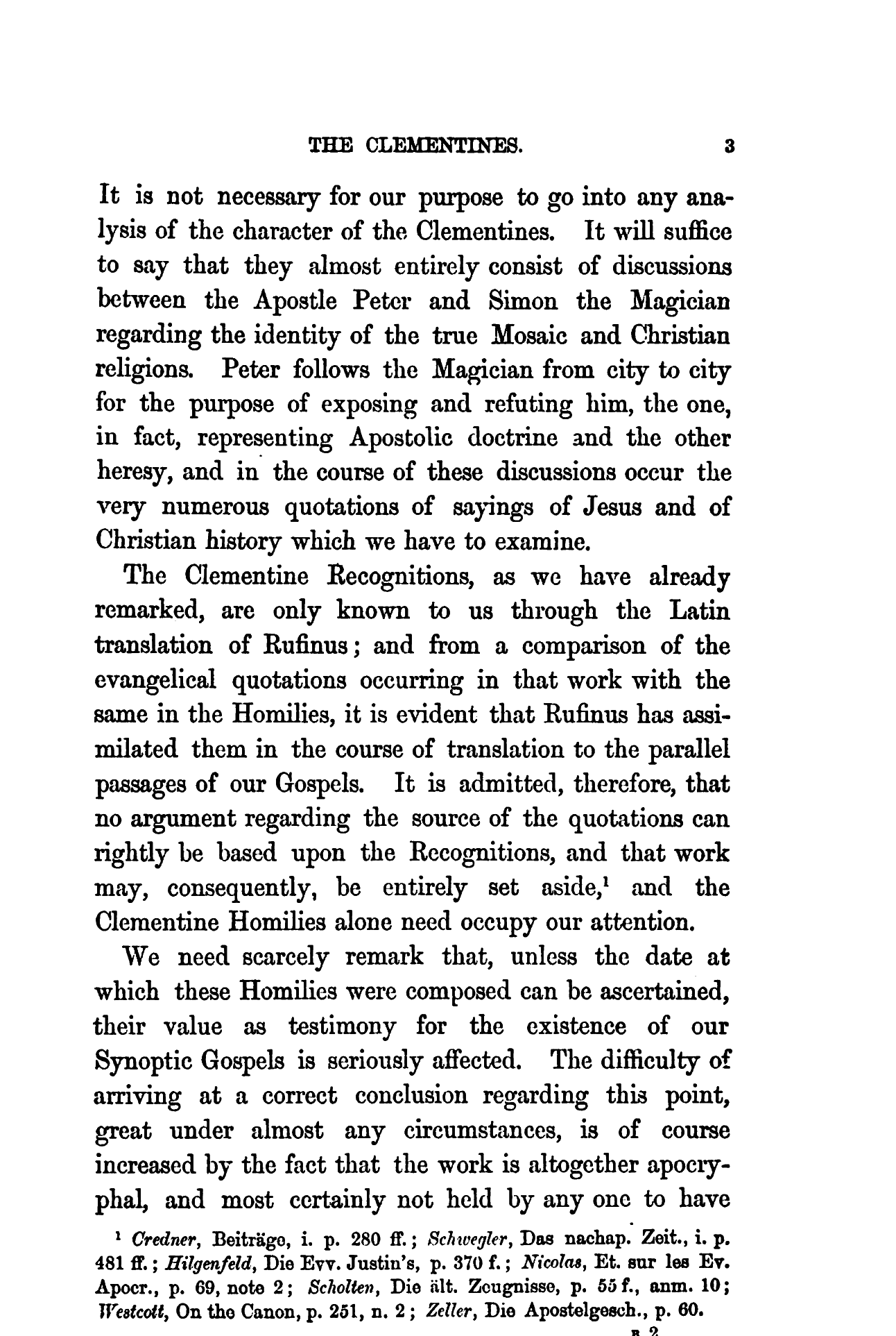 The Clementine Recognitions, as we have already remarked, are only known to us through the Latin translation of Rufinus; and from a comparison of the evangelical quotations occurring in that work with the same in the Homilies, it is evident that Rufinus has assimilated them in the course of translation to the parallel passages of our Gospels. It is admitted, therefore, that no argument regarding the source of the quotations can rightly be based upon the Recognitions, and that work may, consequently, be entirely set aside,(1) and the Clementine Homilies alone need occupy our attention.