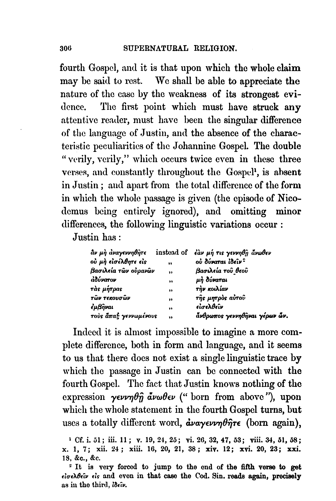 It is not necessary to enter upon any argument to prove the fundamental difference which exists in every respect between the Synoptics and the fourth Gospel. This is admitted even by apologists, whose efforts to reconcile the discordant elements are totally unsuccessful. "It is impossible to pass from the Synoptic Gospels to that of St John," says Canon Westcott, "without feeling that the transition involves the passage from one world of thought to another. No familiarity with the general teaching of the Gospels, no wide conception of the character of the Saviour is sufficient to destroy the