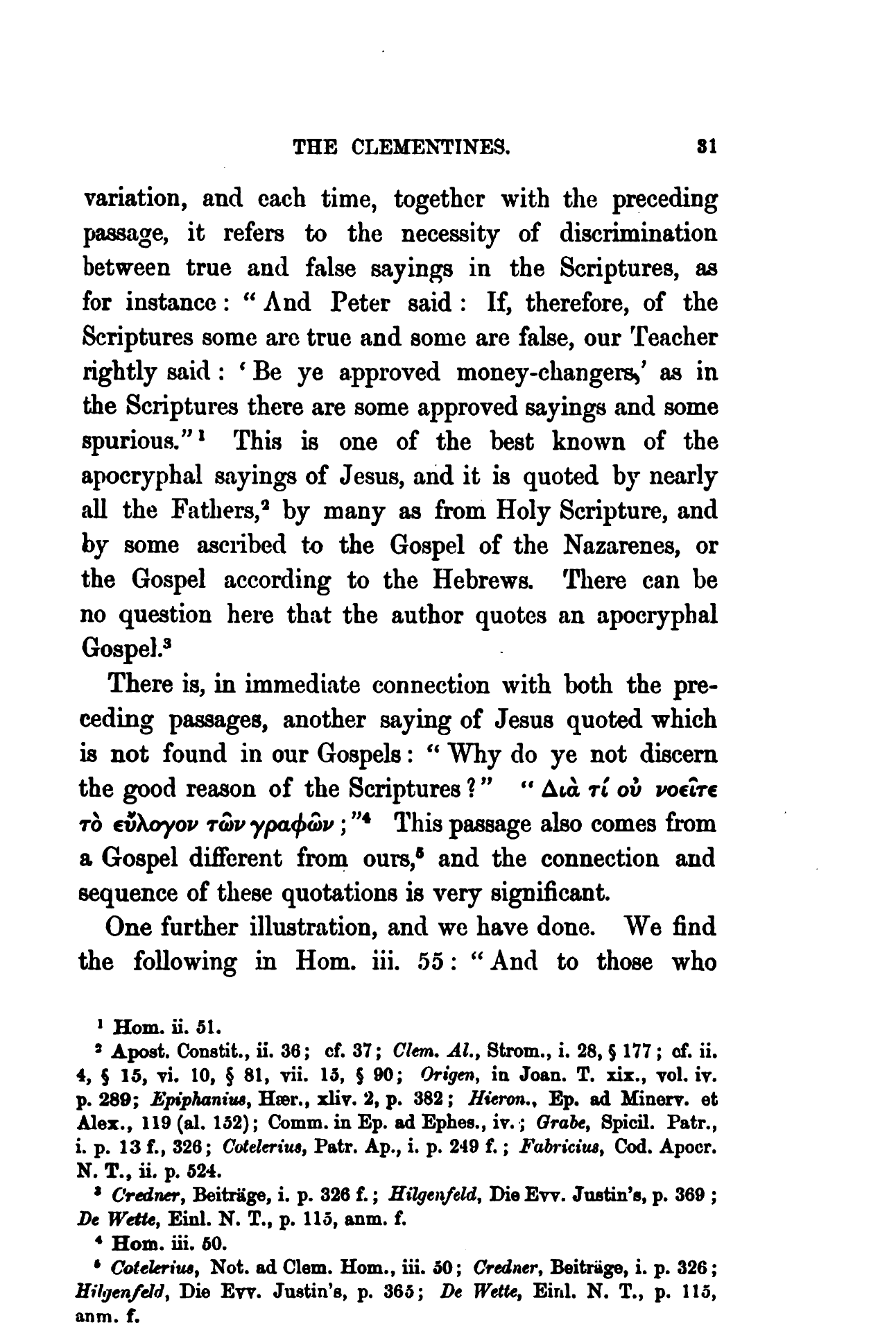 variation, and each time, together with the preceding passage, it refers to the necessity of discrimination between true and false sayings in the Scriptures, as for instance: "And Peter said: If, therefore, of the Scriptures some are true and some are false, our Teacher rightly said: 'Be ye approved money-changers,' as in the Scriptures there are some approved sayings and some spurious."(1) This is one of the best known of the apocryphal sayings of Jesus, and it is quoted by nearly all the Fathers,(2) by many as from Holy Scripture, and by some ascribed to the Gospel of the Nazarenes, or the Gospel according to the Hebrews. There can be no question here that the author quotes an apocryphal Gospel.(3)
