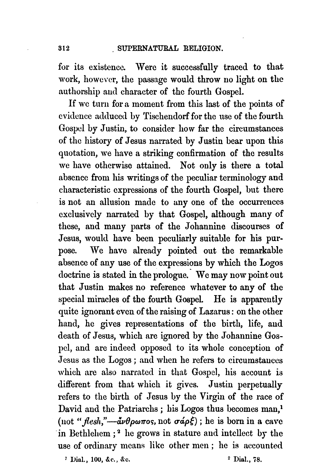 and in his own house" [———]t this passage would undoubtedly be claimed by apologists as a quotation from Mark vi. 4, and as proving the existence and use of that Gospel. The omission of the words "and among his own kin" [———] would at first be explained as mere abbreviation, or defect of memory, but on the discovery that part or all of these words are omitted from some MSS., that for instance the phrase is erased from the oldest manuscript known, the Cod. Sinaiticus, the derivation from the second Gospel would be considered as established. The author notwithstanding might never have seen that Gospel, for the quotation is taken from Matt. xiii. 57.(2)