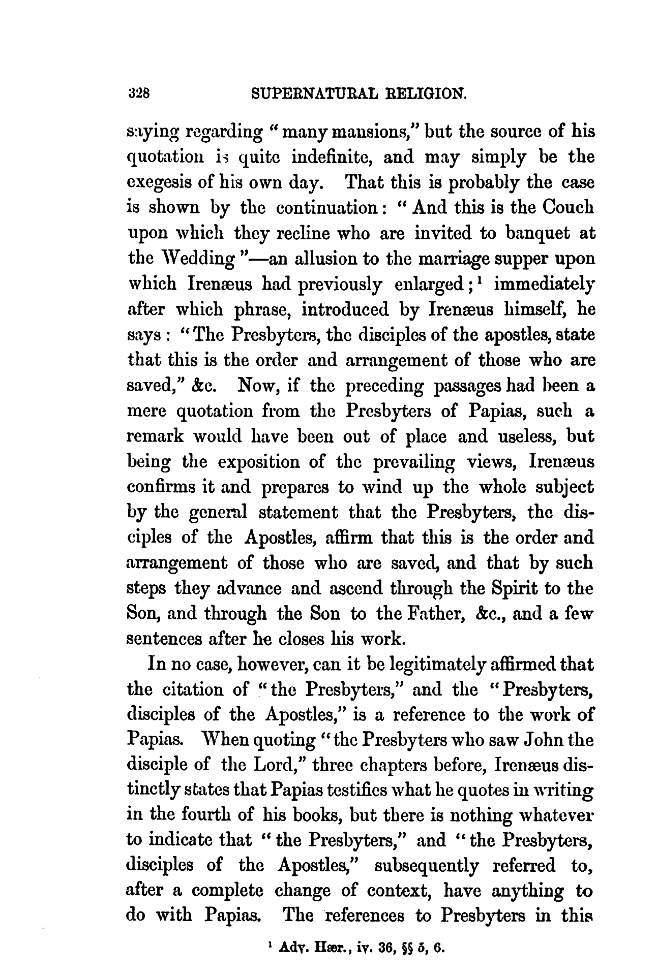 Apostle John. With regard to Papias, the only authority for the assertion that he knew the Epistle is the statement of Eusebius already quoted and discussed, that: "He used testimonies out of John's first Epistle,"(1) There is no evidence, however, even supposing the statement of Eusebius to be correct, that he ascribed it to the Apostle. The earliest undoubted references to the Epistle, in fact, are by Irenæus and Clement of Alexandria, so that this evidence is of little avail for the Gospel. There is no name attached to the first Epistle, and the second and third have the superscription of "the Presbyter," which, applying the argument of Ewald regarding the author of the Apocalypse, ought to be conclusive against their being written by an Apostle. As all three are evidently by the same writer, and intended to be understood as by the author of the Gospel, and that writer does not pretend to be an Apostle, but calls himself a simple Presbyter, the Epistles likewise give presumptive evidence against the apostolic authorship of the Gospel.