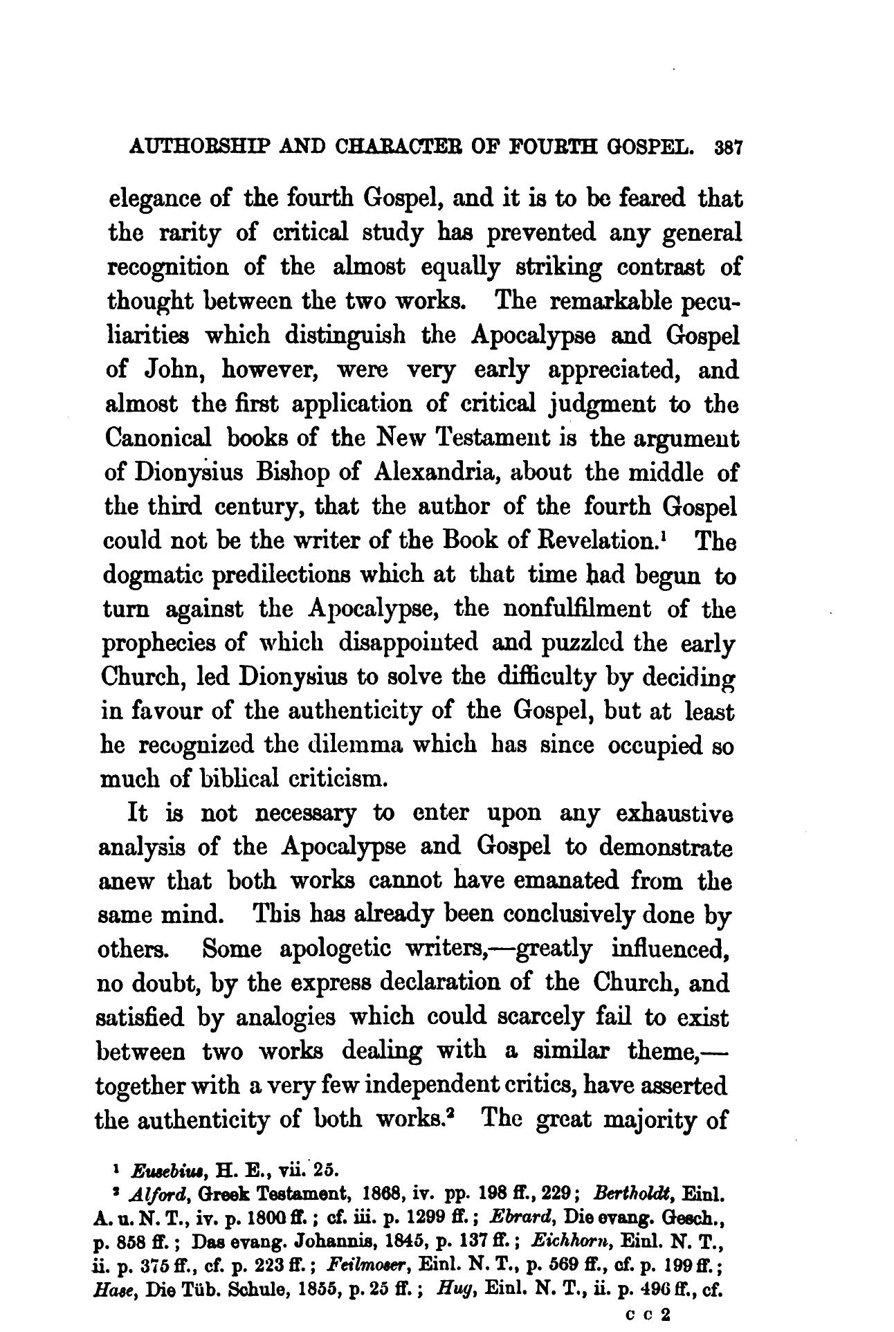 have already refuted so erroneous an interpretation of the words of Christ, and it would then have been much more appropriate to explain afresh the sense of the words 'till I come.' Moreover, there is no reference here to the death as having already occurred, although a small addition to that effect in ver. 24 would have been so easy. But if we were to suppose that John had long been dead when this was written, the whole rectification as it is given would be utterly without sense."(1) On the contrary, we affirm that the whole history of the first two centuries renders it certain that the Apostle was already dead, and that the explanation was not a rectification of false hopes during his lifetime, but an explanation of the failure of expectations which had already taken place, and probably excited some scandal. We know how the early Church looked for the immediate coming of the glorified Christ, and how such hopes sustained persecuted Christians in their sorrow and suffering. This is very clearly expressed in 1 Thess. iv. 15—18, where the expectation of the second coming within the lifetime of the writer and readers of the Epistle is confidently stated, and elsewhere, and even in 1 John ii. 18, the belief that the "last times" had arrived is expressed. The history of the Apocalypse in relation to the Canon illustrates the case. So long as the belief in the early consummation of all things continued strong, the Apocalypse was the favourite writing of the early Church, but when time went on, and the second coming of Christ did not take place, the opinion of Christendom regarding the work changed, and disappointment, as well as the desire to explain the non-fulfilment of prophecies upon which so much hope had been based, led many to reject the Apocalypse