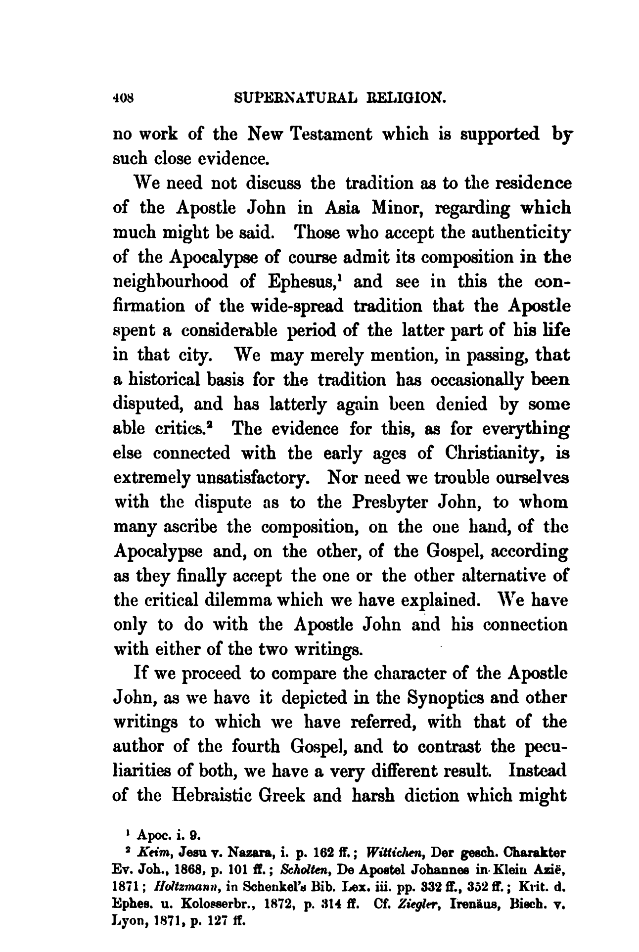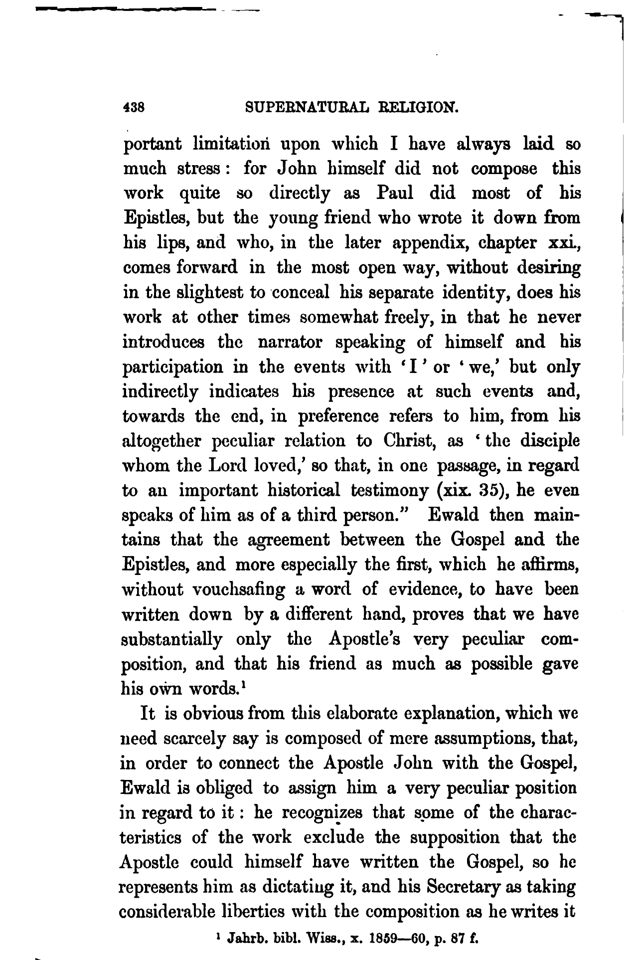 It is obvious from this elaborate explanation, which we need scarcely say is composed of mere assumptions, that, in order to connect the Apostle John with the Gospel, Ewald is obliged to assign him a very peculiar position in regard to it: he recognizes that some of the characteristics of the work exclude the supposition that the Apostle could himself have written the Gospel, so he represents him as dictating it, and his Secretary as taking considerable liberties with the composition as he writes it