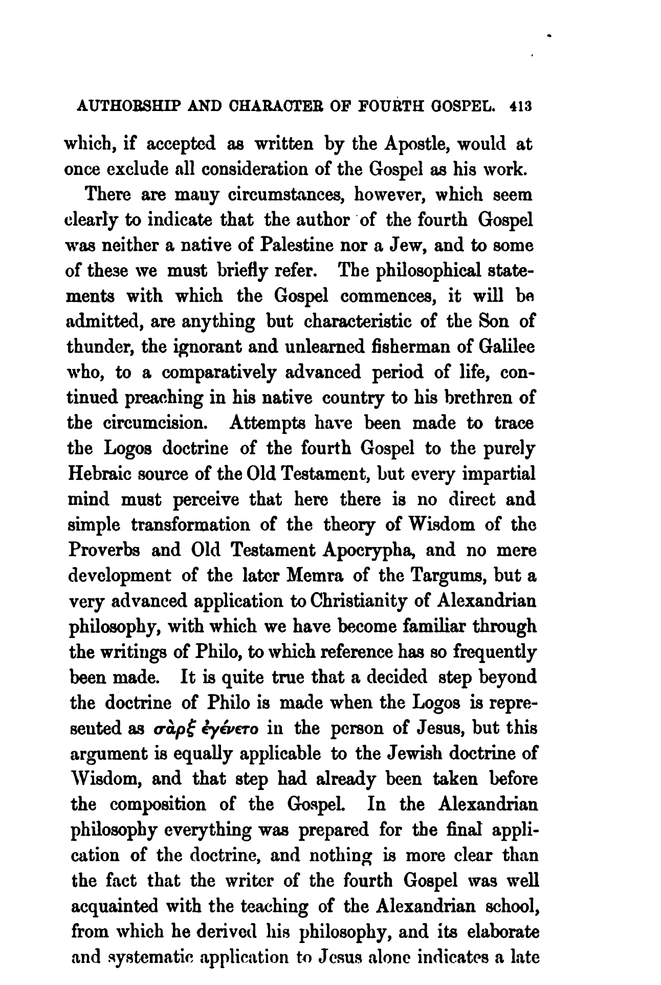 Now all such admissions, whilst they are absolutely requisite to explain the undeniable phenomena of the fourth Gospel, have one obvious consequence: The fourth Gospel, by whomsoever written,—even if it could be traced to the Apostle John himself,—has no real historical value, being at best the "glorified recollections" of an old man, written down half a century after the events recorded. The absolute difference between the teaching of this Gospel and of the Synoptics becomes perfectly intelligible, when the long discourses are recognized to be the result of Alexandrian Philosophy artistically interwoven with developed Pauline Christianity, and put into the mouth of Jesus. It will have been remarked that along with the admission of great subjectivity in the report of the discourses, and the plea that nothing beyond the mere substance of the original teaching can reasonably be looked for, there is, in the extracts we have given, an assertion that there actually is a faithful reproduction in this Gospel of the original substance. There is not a shadow of proof of this, but on the contrary the strongest reason for denying the fact; for, unless it be admitted that the Synoptics have so completely omitted the whole doctrinal part of the teaching of Jesus, have so carefully avoided the very peculiar terminology of the Logos Gospel, and have conveyed so unhistorical and erroneous an impression of the life and religious system of Jesus that, without the fourth Gospel, we should not actually have had an idea of his fundamental doctrines, we must inevitably recognize that the fourth Gospel cannot possibly be a true reproduction of his teaching. It is impossible that Jesus can have had two such diametrically opposed systems of teaching,—one purely moral, the other wholly dogmatic; one expressed in