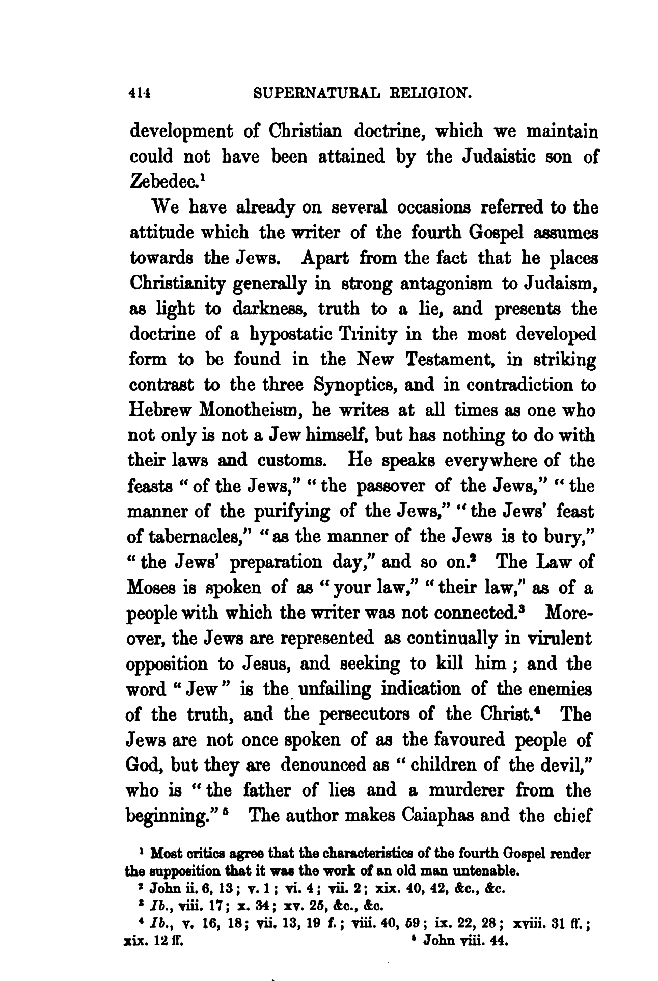 We have seen that, whilst there is not one particle of evidence during a century and a half after the events recorded in the fourth Gospel that it was composed by the son of Zebedee, there is, on the contrary, the strongest reason for believing that he did not write it. The first writer who quotes a passage of the Gospel with the mention of his name is Theophilus of Antioch, who gives the few words: "In the beginning was the Word and the Word was with God," as spoken by "John," whom he considers amongst the divinely inspired [———]