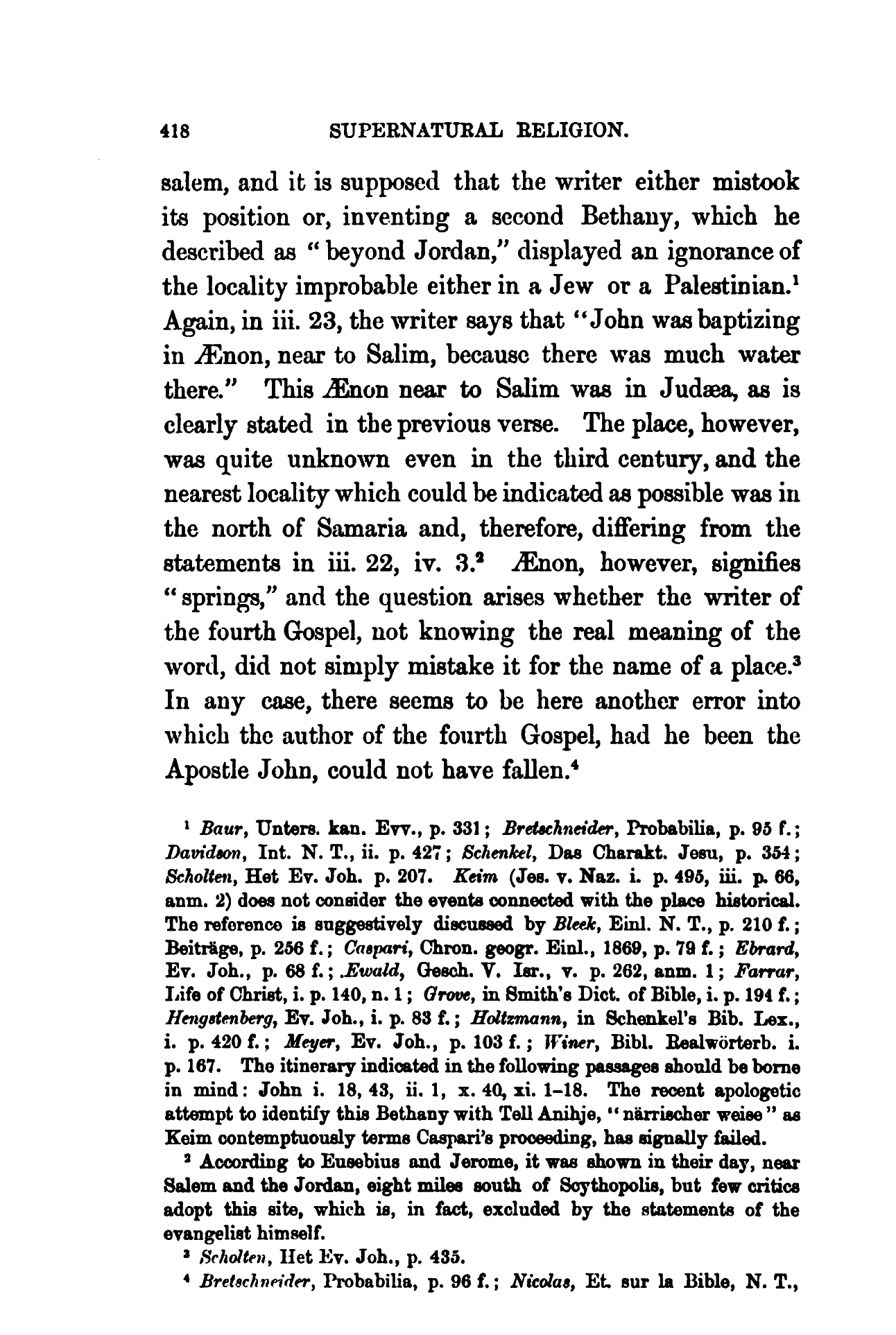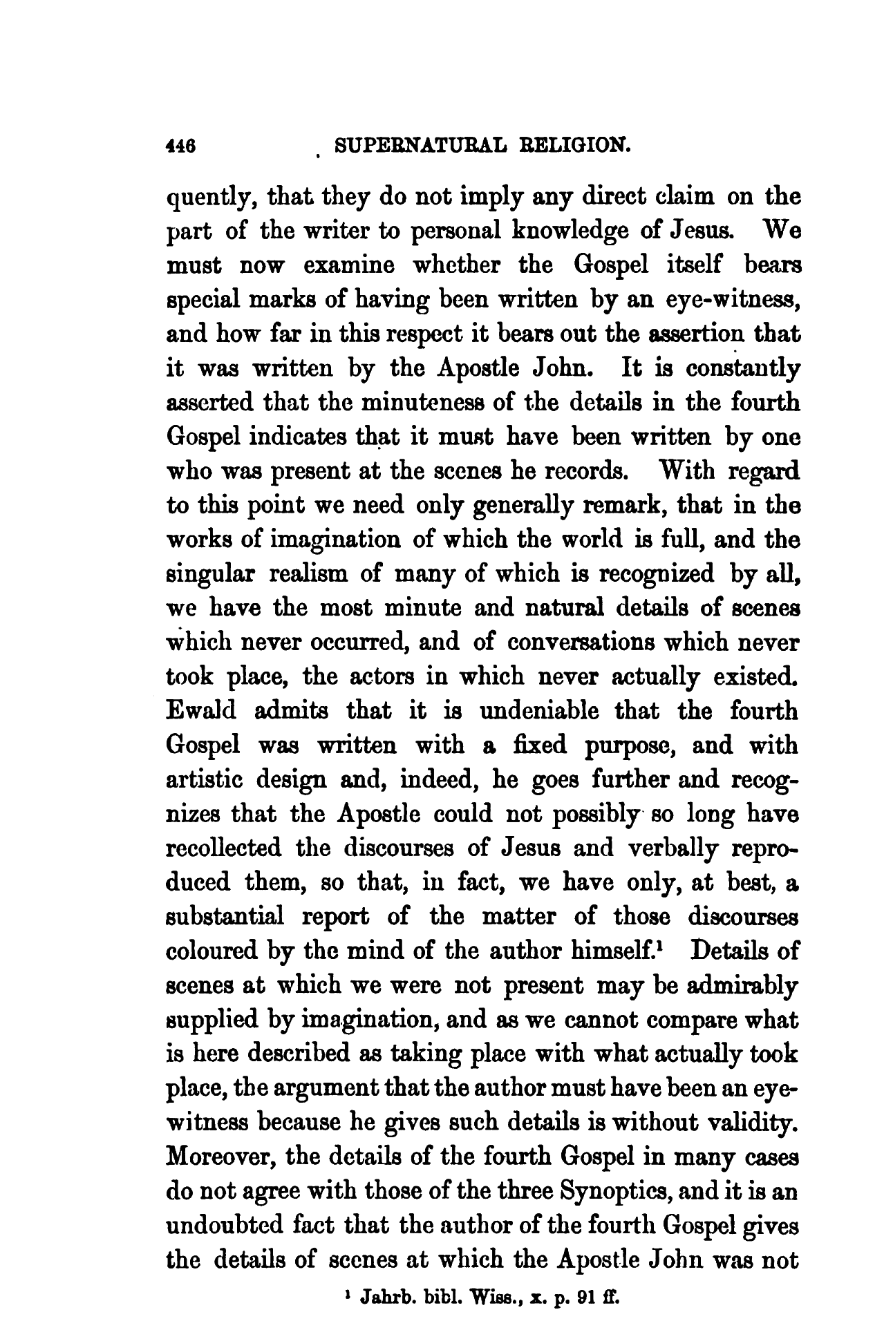 consequently, that they do not imply any direct claim on the part of the writer to personal knowledge of Jesus. We must now examine whether the Gospel itself bears special marks of having been written by an eye-witness, and how far in this respect it bears out the assertion that it was written by the Apostle John. It is constantly asserted that the minuteness of the details in the fourth Gospel indicates that it must have been written by one who was present at the scenes he records. With regard to this point we need only generally remark, that in the works of imagination of which the world is full, and the singular realism of many of which is recognized by all, we have the most minute and natural details of scenes which never occurred, and of conversations which never took place, the actors in which never actually existed. Ewald admits that it is undeniable that the fourth Gospel was written with a fixed purpose, and with artistic design and, indeed, he goes further and recognizes that the Apostle could not possibly so long have recollected the discourses of Jesus and verbally reproduced them, so that, in fact, we have only, at best, a substantial report of the matter of those discourses coloured by the mind of the author himself.(1) Details of scenes at which we were not present may be admirably supplied by imagination, and as we cannot compare what is here described as taking place with what actually took place, the argument that the author must have been an eyewitness because he gives such details is without validity. Moreover, the details of the fourth Gospel in many cases do not agree with those of the three Synoptics, and it is an undoubted fact that the author of the fourth Gospel gives the details of scenes at which the Apostle John was not