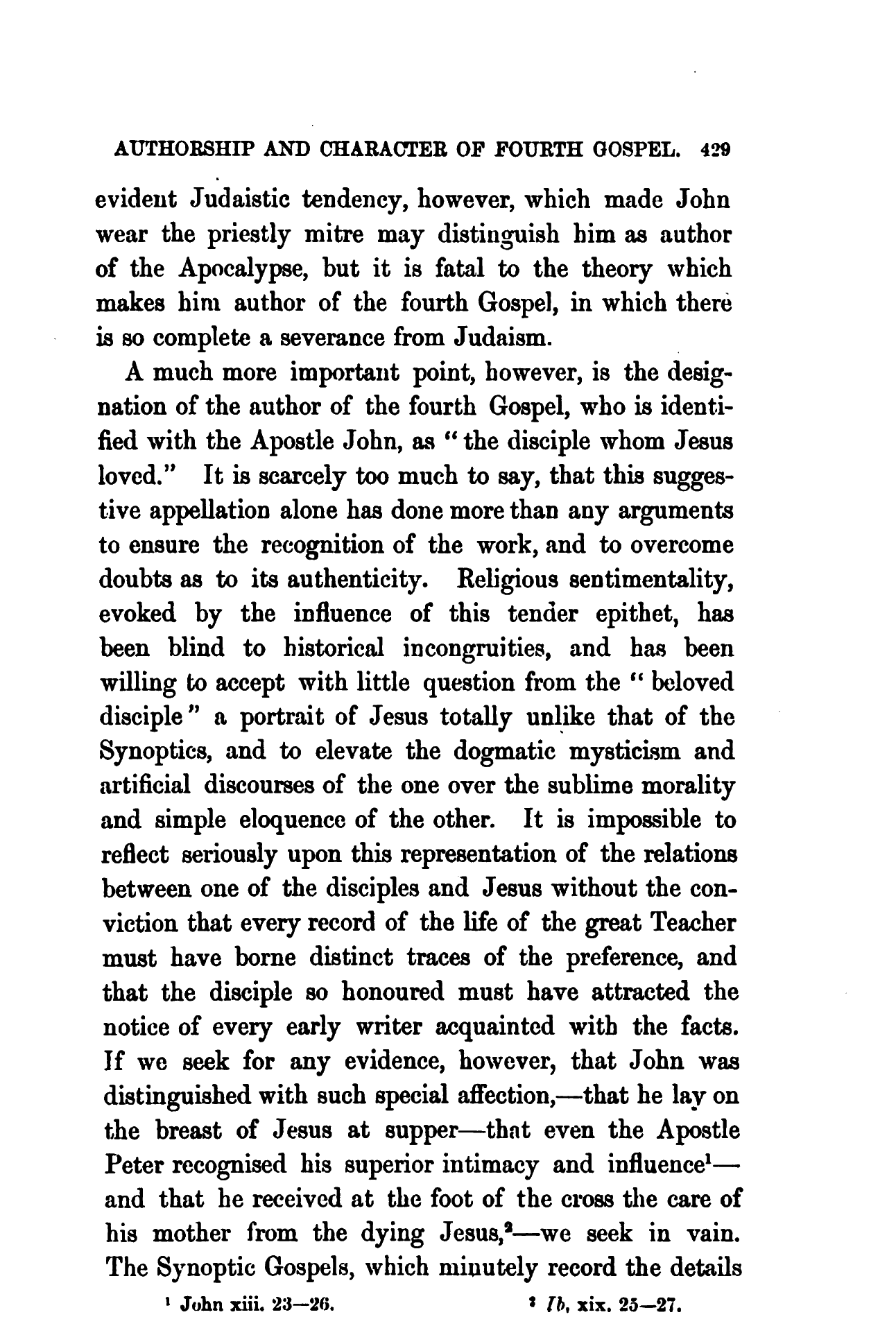 A much more important point, however, is the designation of the author of the fourth Gospel, who is identified with the Apostle John, as "the disciple whom Jesus loved." It is scarcely too much to say, that this suggestive appellation alone has done more than any arguments to ensure the recognition of the work, and to overcome doubts as to its authenticity. Religious sentimentality, evoked by the influence of this tender epithet, has been blind to historical incongruities, and has been willing to accept with little question from the "beloved disciple" a portrait of Jesus totally unlike that of the Synoptics, and to elevate the dogmatic mysticism and artificial discourses of the one over the sublime morality and simple eloquence of the other. It is impossible to reflect seriously upon this representation of the relations between one of the disciples and Jesus without the conviction that every record of the life of the great Teacher must have borne distinct traces of the preference, and that the disciple so honoured must have attracted the notice of every early writer acquainted with the facts. If we seek for any evidence, however, that John was distinguished with such special affection,—that he lay on the breast of Jesus at supper—that even the Apostle Peter recognised his superior intimacy and influence(1)—and that he received at the foot of the cross the care of his mother from the dying Jesus,(2)—we seek in vain. The Synoptic Gospels, which minutely record the details
