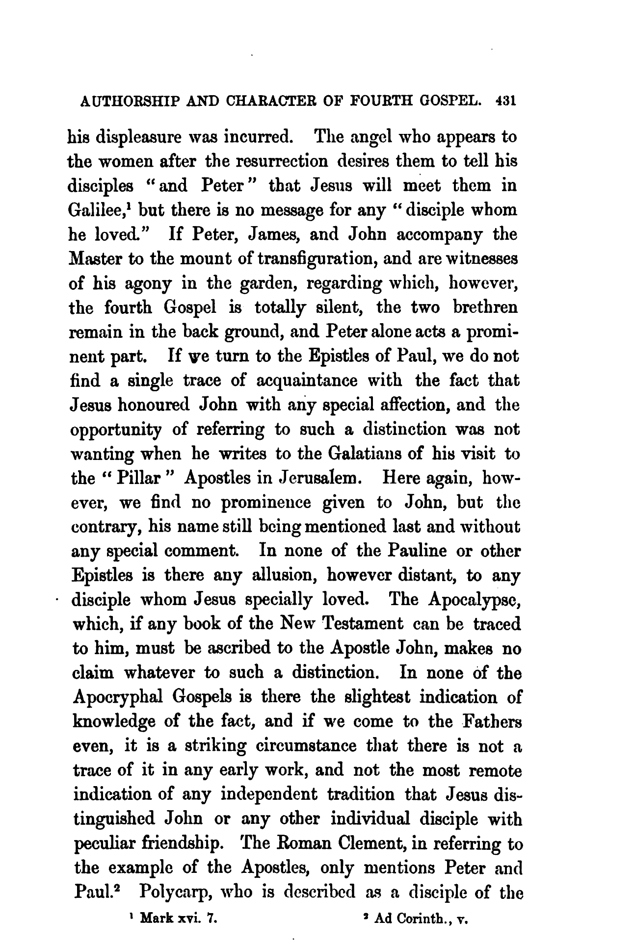 his displeasure was incurred. The angel who appears to the women after the resurrection desires them to tell his disciples "and Peter" that Jesus will meet them in Galilee,(1) but there is no message for any "disciple whom he loved." If Peter, James, and John accompany the Master to the mount of transfiguration, and are witnesses of his agony in the garden, regarding which, however, the fourth Gospel is totally silent, the two brethren remain in the back ground, and Peter alone acts a prominent part. If we turn to the Epistles of Paul, we do not find a single trace of acquaintance with the fact that Jesus honoured John with any special affection, and the opportunity of referring to such a distinction was not wanting when he writes to the Galatians of his visit to the "Pillar" Apostles in Jerusalem. Here again, however, we find no prominence given to John, but the contrary, his name still being mentioned last and without any special comment. In none of the Pauline or other Epistles is there any allusion, however distant, to any disciple whom Jesus specially loved. The Apocalypse, which, if any book of the New Testament can be traced to him, must be ascribed to the Apostle John, makes no claim whatever to such a distinction. In none of the Apocryphal Gospels is there the slightest indication of knowledge of the fact, and if we come to the Fathers even, it is a striking circumstance that there is not a trace of it in any early work, and not the most remote indication of any independent tradition that Jesus distinguished John or any other individual disciple with peculiar friendship. The Roman Clement, in referring to the example of the Apostles, only mentions Peter and Paul.(2) Polycarp, who is described as a disciple of the