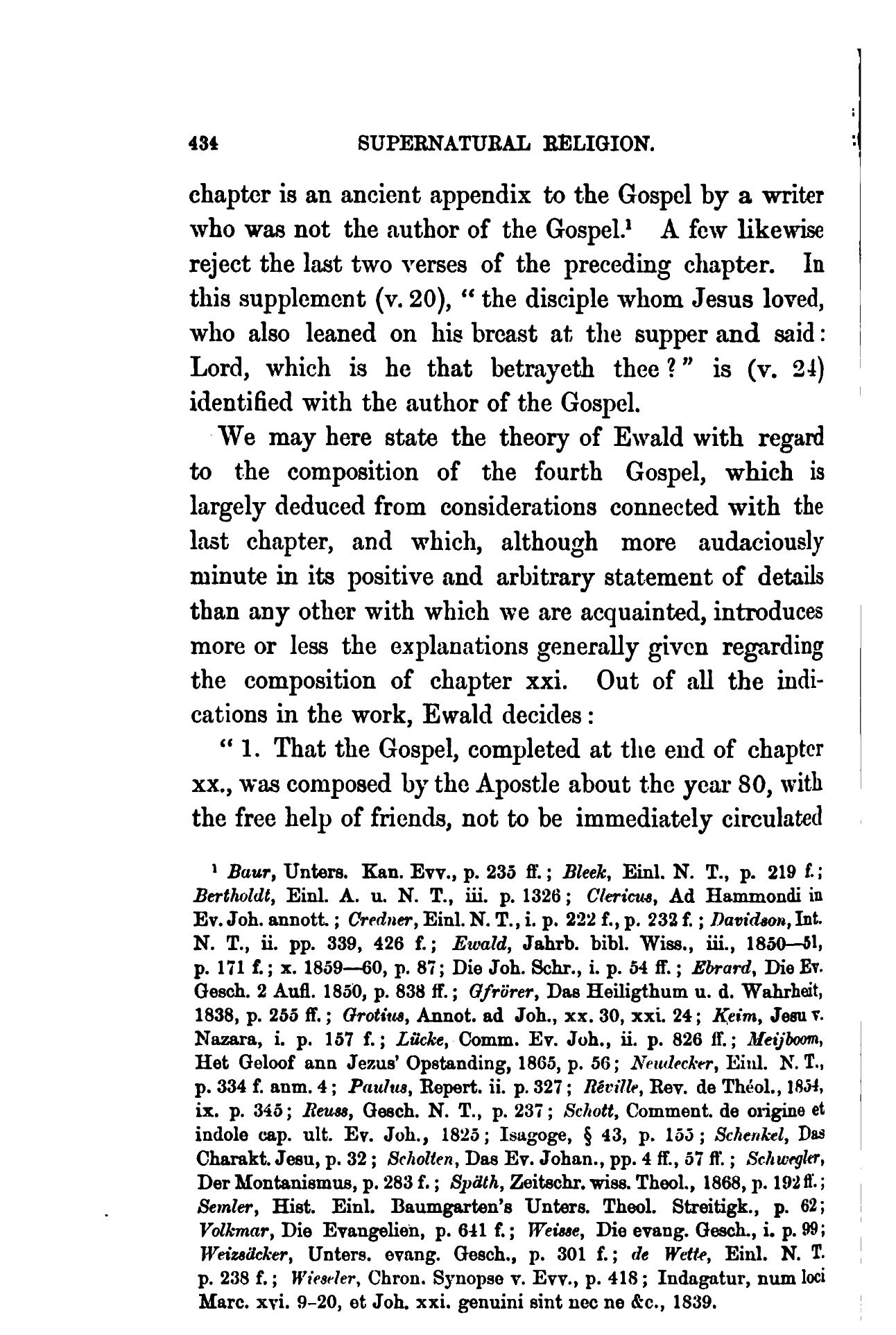 We have hitherto refrained from referring to one of the most singular features of the fourth Gospel, the chapter xxi., which is by many cited as the most ancient testimony for the authenticity of the work, and which requires particular consideration. It is obvious that the Gospel is brought to a conclusion by verses 30, 31 of chapter xx., and critics are universally agreed at least that, whoever may be its author, chapter xxi. is a supplement only added after an interval. By whom was it written? As may be supposed, critics have given very different replies to this important question. Many affirm, and with much probability, that chapter xxi. was subsequently added to the Gospel by the author himself.(2) A few, however, exclude the last two verses, which they consider to have been added by another hand.(3) A much larger number assert that the whole