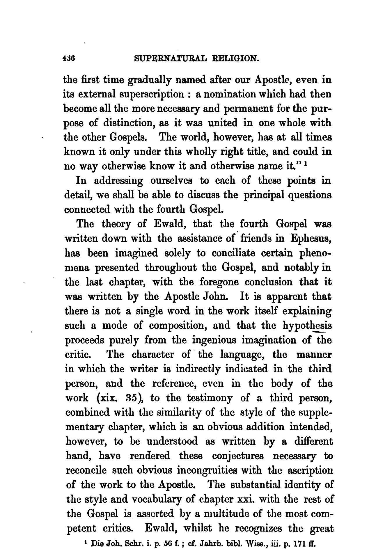 We may here state the theory of Ewald with regard to the composition of the fourth Gospel, which is largely deduced from considerations connected with the last chapter, and which, although more audaciously minute in its positive and arbitrary statement of details than any other with which we are acquainted, introduces more or less the explanations generally given regarding the composition of chapter xxi. Out of all the indications in the work, Ewald decides: