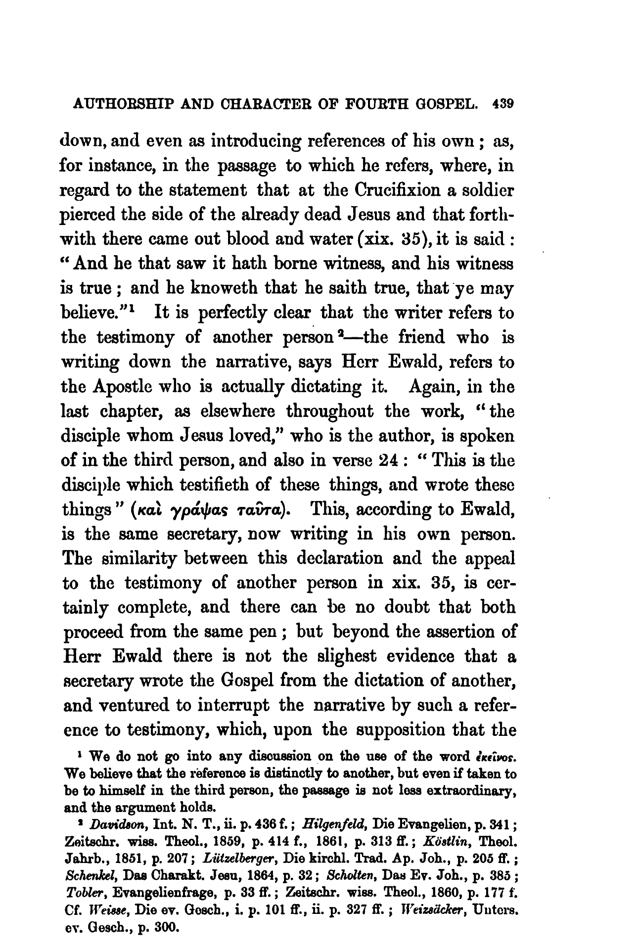 down, and even as introducing references of his own; as, for instance, in the passage to which he refers, where, in regard to the statement that at the Crucifixion a soldier pierced the side of the already dead Jesus and that forthwith there came out blood and water (xix. 35), it is said: "And he that saw it hath borne witness, and his witness is true; and he knoweth that he saith true, that ye may believe."(1) It is perfectly clear that the writer refers to the testimony of another person(2)—the friend who is writing down the narrative, says Herr Ewald, refers to the Apostle who is actually dictating it. Again, in the last chapter, as elsewhere throughout the work, "the disciple whom Jesus loved," who is the author, is spoken of in the third person, and also in verse 24: "This is the disciple which testifieth of these things, and wrote these things" [———]. This, according to Ewald, is the same secretary, now writing in his own person. The similarity between this declaration and the appeal to the testimony of another person in xix. 35, is certainly complete, and there can be no doubt that both proceed from the same pen; but beyond the assertion of Herr Ewald there is not the slightest evidence that a secretary wrote the Gospel from the dictation of another, and ventured to interrupt the narrative by such a reference to testimony, which, upon the supposition that the