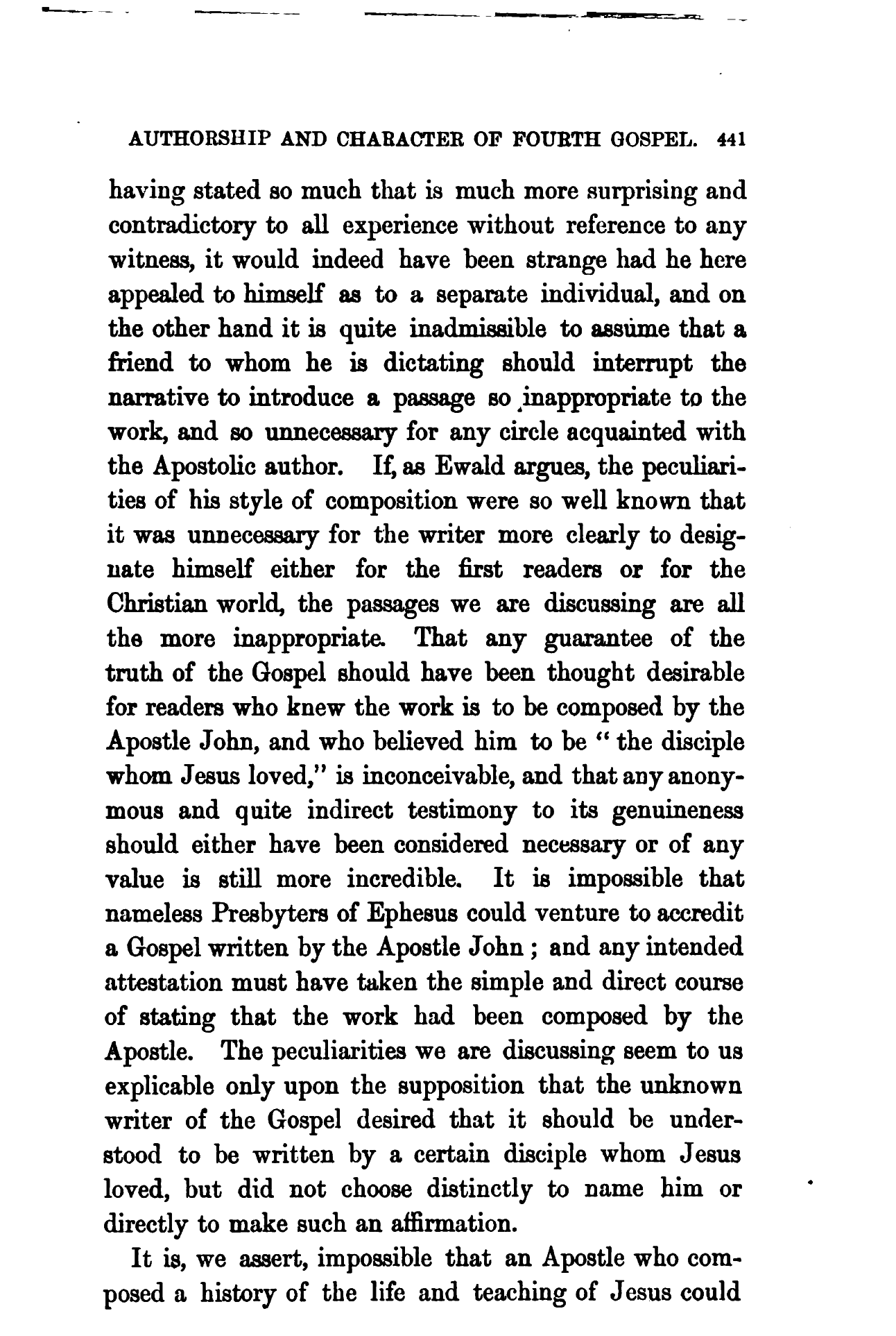 having stated so much that is much more surprising and contradictory to all experience without reference to any witness, it would indeed have been strange had he here appealed to himself as to a separate individual, and on the other hand it is quite inadmissible to assume that a Mend to whom he is dictating should interrupt the narrative to introduce a passage so inappropriate to the work, and so unnecessary for any circle acquainted with the Apostolic author. If, as Ewald argues, the peculiarities of his style of composition were so well known that it was unnecessary for the writer more clearly to designate himself either for the first readers or for the Christian world, the passages we are discussing are all the more inappropriate. That any guarantee of the truth of the Gospel should have been thought desirable for readers who knew the work is to be composed by the Apostle John, and who believed him to be "the disciple whom Jesus loved," is inconceivable, and that any anonymous and quite indirect testimony to its genuineness should either have been considered necessary or of any value is still more incredible. It is impossible that nameless Presbyters of Ephesus could venture to accredit a Gospel written by the Apostle John; and any intended attestation must have taken the simple and direct course of stating that the work had been composed by the Apostle. The peculiarities we are discussing seem to us explicable only upon the supposition that the unknown writer of the Gospel desired that it should be understood to be written by a certain disciple whom Jesus loved, but did not choose distinctly to name him or directly to make such an affirmation.