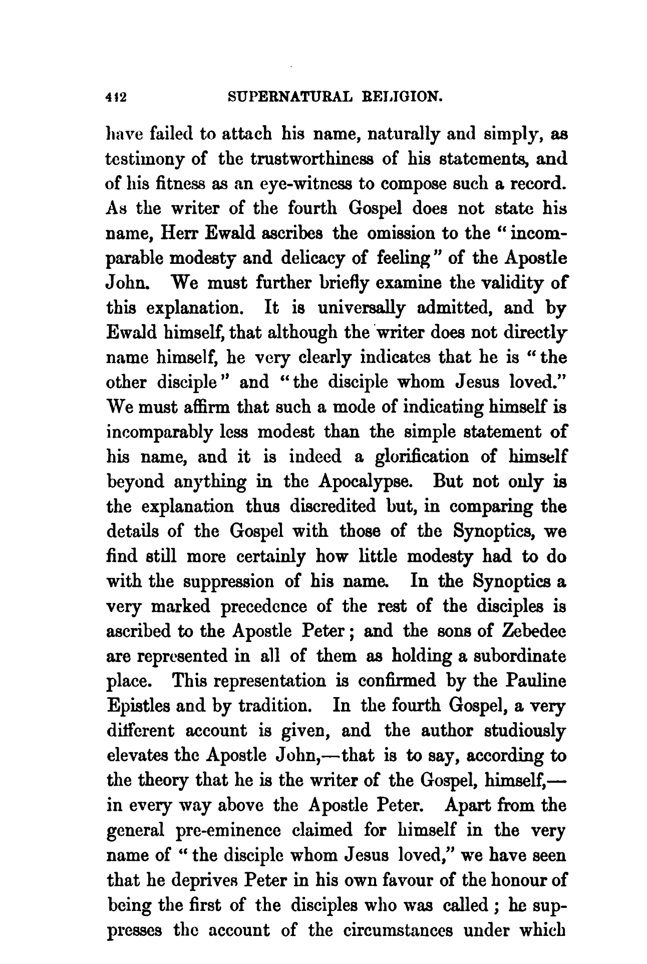 have failed to attach his name, naturally and simply, as testimony of the trustworthiness of his statements, and of his fitness as an eye-witness to compose such a record. As the writer of the fourth Gospel does not state his name, Herr Ewald ascribes the omission to the "incomparable modesty and delicacy of feeling" of the Apostle John. We must further briefly examine the validity of this explanation. It is universally admitted, and by Ewald himself, that although the writer does not directly name himself, he very clearly indicates that he is "the other disciple" and "the disciple whom Jesus loved." We must affirm that such a mode of indicating himself is incomparably less modest than the simple statement of his name, and it is indeed a glorification of himself beyond anything in the Apocalypse. But not only is the explanation thus discredited but, in comparing the details of the Gospel with those of the Synoptics, we find still more certainly how little modesty had to do with the suppression of his name. In the Synoptics a very marked precedence of the rest of the disciples is ascribed to the Apostle Peter; and the sons of Zebedee are represented in all of them as holding a subordinate place. This representation is confirmed by the Pauline Epistles and by tradition. In the fourth Gospel, a very different account is given, and the author studiously elevates the Apostle John,—that is to say, according to the theory that he is the writer of the Gospel, himself,—in every way above the Apostle Peter. Apart from the general pre-eminence claimed for himself in the very name of "the disciple whom Jesus loved," we have seen that he deprives Peter in his own favour of the honour of being the first of the disciples who was called; he suppresses the account of the circumstances under which