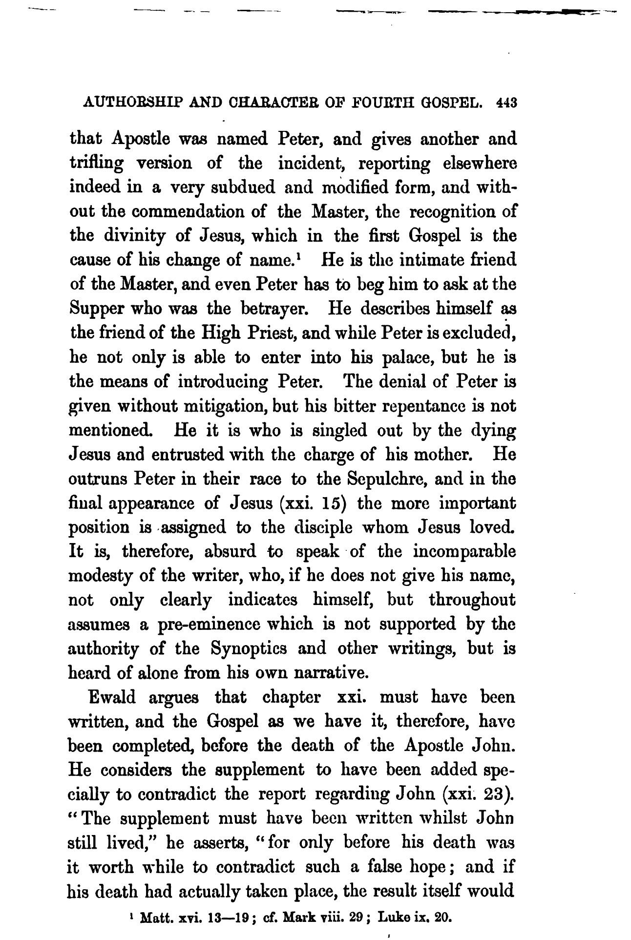 that Apostle was named Peter, and gives another and trifling version of the incident, reporting elsewhere indeed in a very subdued and modified form, and without the commendation of the Master, the recognition of the divinity of Jesus, which in the first Gospel is the cause of his change of name.(1) He is the intimate friend of the Master, and even Peter has to beg him to ask at the Supper who was the betrayer. He describes himself as the friend of the High Priest, and while Peter is excluded, he not only is able to enter into his palace, but he is the means of introducing Peter. The denial of Peter is given without mitigation, but his bitter repentance is not mentioned. He it is who is singled out by the dying Jesus and entrusted with the charge of his mother. He outruns Peter in their race to the Sepulchre, and in the final appearance of Jesus (xxi. 15) the more important position is assigned to the disciple whom Jesus loved. It is, therefore, absurd to speak of the incomparable modesty of the writer, who, if he does not give his name, not only clearly indicates himself, but throughout assumes a pre-eminence which is not supported by the authority of the Synoptics and other writings, but is heard of alone from his own narrative.