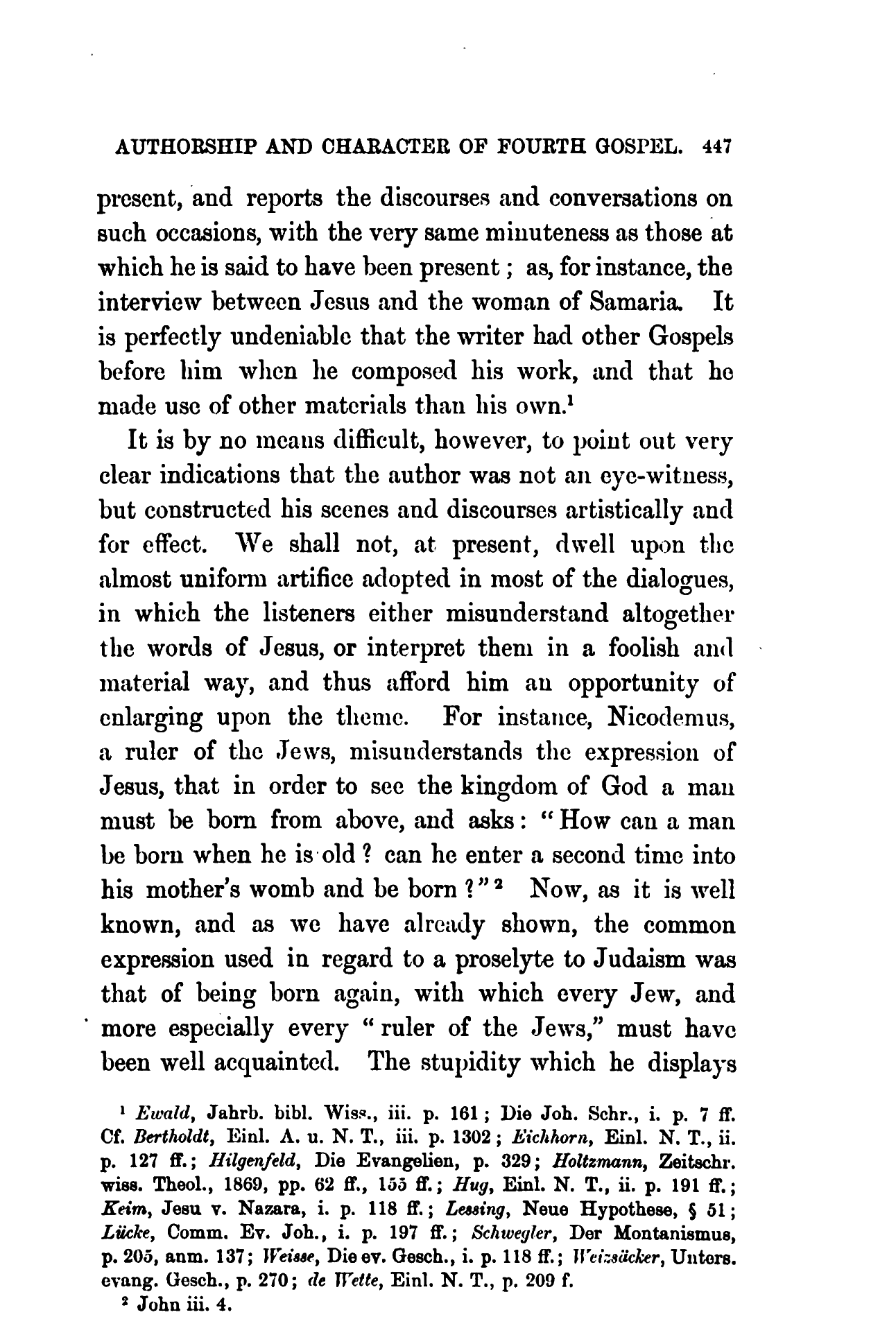 It is by no means difficult, however, to point out very clear indications that the author was not an eye-witness, but constructed his scenes and discourses artistically and for effect. We shall not, at present, dwell upon the almost uniform artifice adopted in most of the dialogues, in which the listeners either misunderstand altogether the words of Jesus, or interpret them in a foolish and material way, and thus afford him an opportunity of enlarging upon the theme. For instance, Nicodemus, a ruler of the Jews, misunderstands the expression of Jesus, that in order to see the kingdom of God a man must be born from above, and asks: "How can a man be born when he is old? can he enter a second time into his mothers womb and be born?"(2) Now, as it is well known, and as we have already shown, the common expression used in regard to a proselyte to Judaism was that of being born again, with which every Jew, and more especially every "ruler of the Jews," must have been well acquainted. The stupidity which he displays