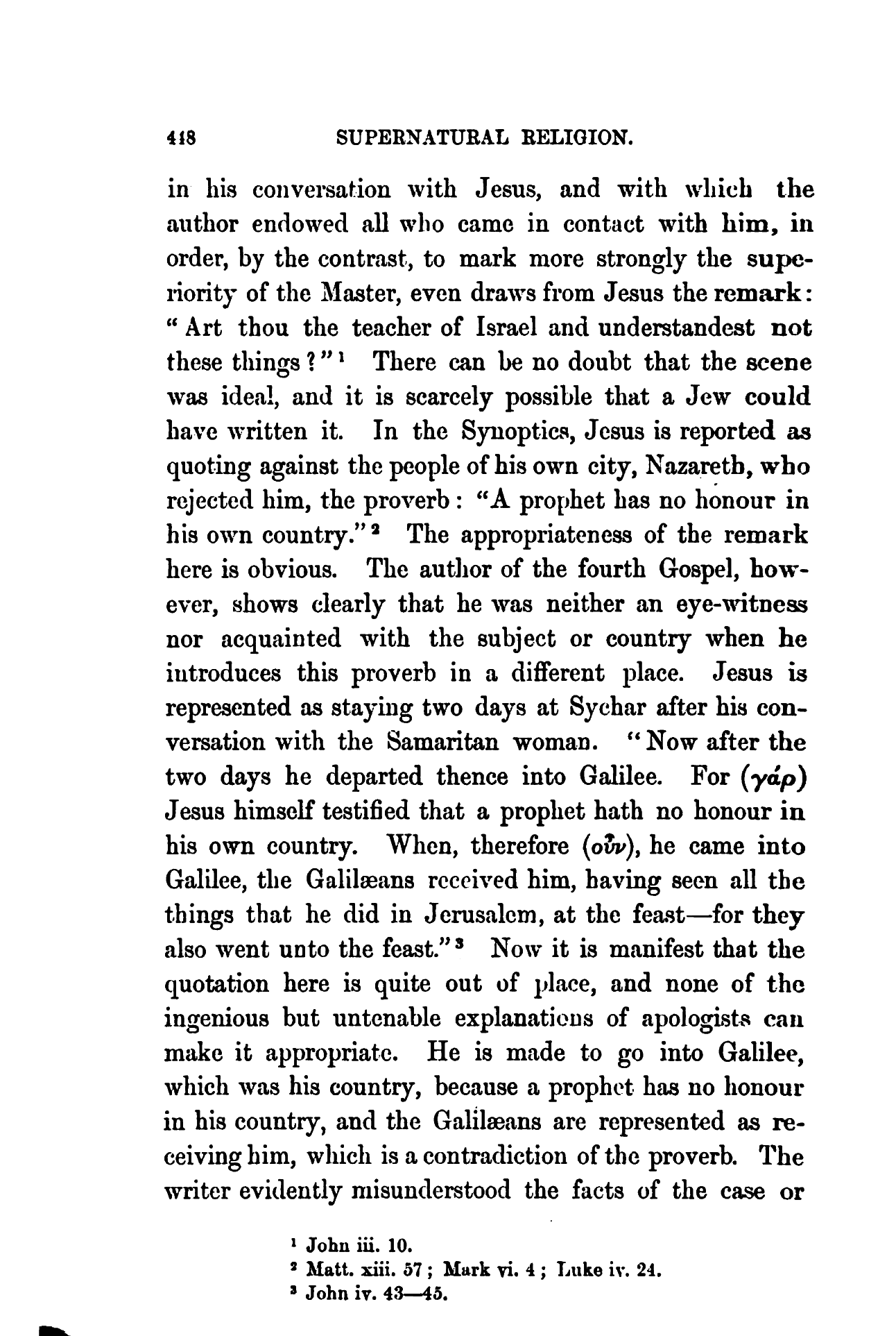 in his conversation with Jesus, and with which the author endowed all who came in contact with him, in order, by the contrast, to mark more strongly the superiority of the Master, even draws from Jesus the remark: "Art thou the teacher of Israel and understandest not these things?"(l) There can be no doubt that the scene was ideal, and it is scarcely possible that a Jew could have written it. In the Synoptics, Jesus is reported as quoting against the people of his own city, Nazareth, who rejected him, the proverb: "A prophet has no honour in his own country."(2) The appropriateness of the remark here is obvious. The author of the fourth Gospel, however, shows clearly that he was neither an eye-witness nor acquainted with the subject or country when he introduces this proverb in a different place. Jesus is represented as staying two days at Sychar after his conversation with the Samaritan woman. "Now after the two days he departed thence into Galilee. For [———] Jesus himself testified that a prophet hath no honour in his own country. When, therefore [———], he came into Galilee, the Galilaeans received him, having seen all the things that he did in Jerusalem, at the feast—for they also went unto the feast."(3) Now it is manifest that the quotation here is quite out of place, and none of the ingenious but untenable explanations of apologists can make it appropriate. He is made to go into Galilee, which was his country, because a prophet has no honour in his country, and the Galilaeans are represented as receiving him, which is a contradiction of the proverb. The writer evidently misunderstood the facts of the case or
