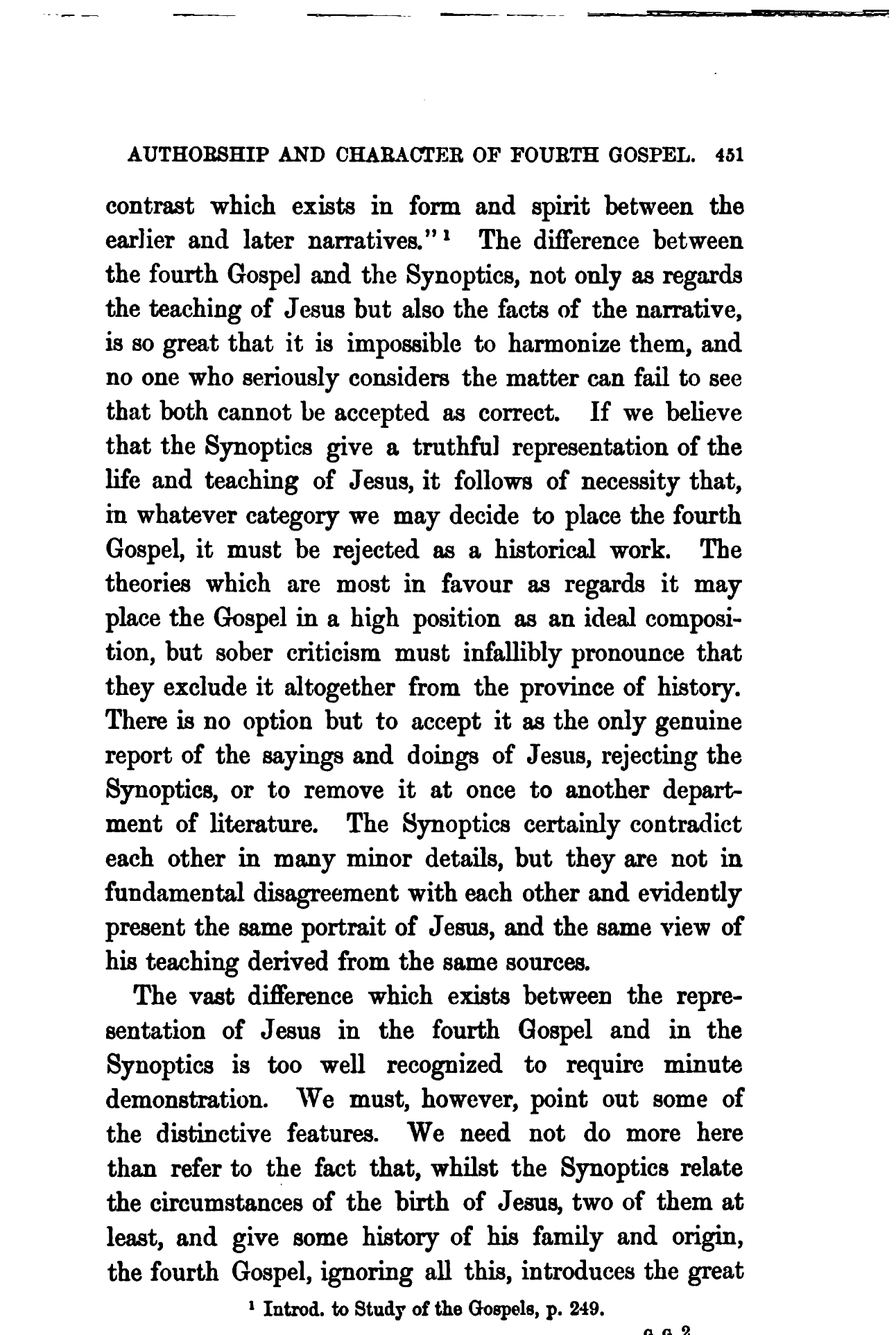 The vast difference which exists between the representation of Jesus in the fourth Gospel and in the Synoptics is too well recognized to require minute demonstration. We must, however, point out some of the distinctive features. We need not do more here than refer to the fact that, whilst the Synoptics relate the circumstances of the birth of Jesus, two of them at least, and give some history of his family and origin, the fourth Gospel, ignoring all this, introduces the great