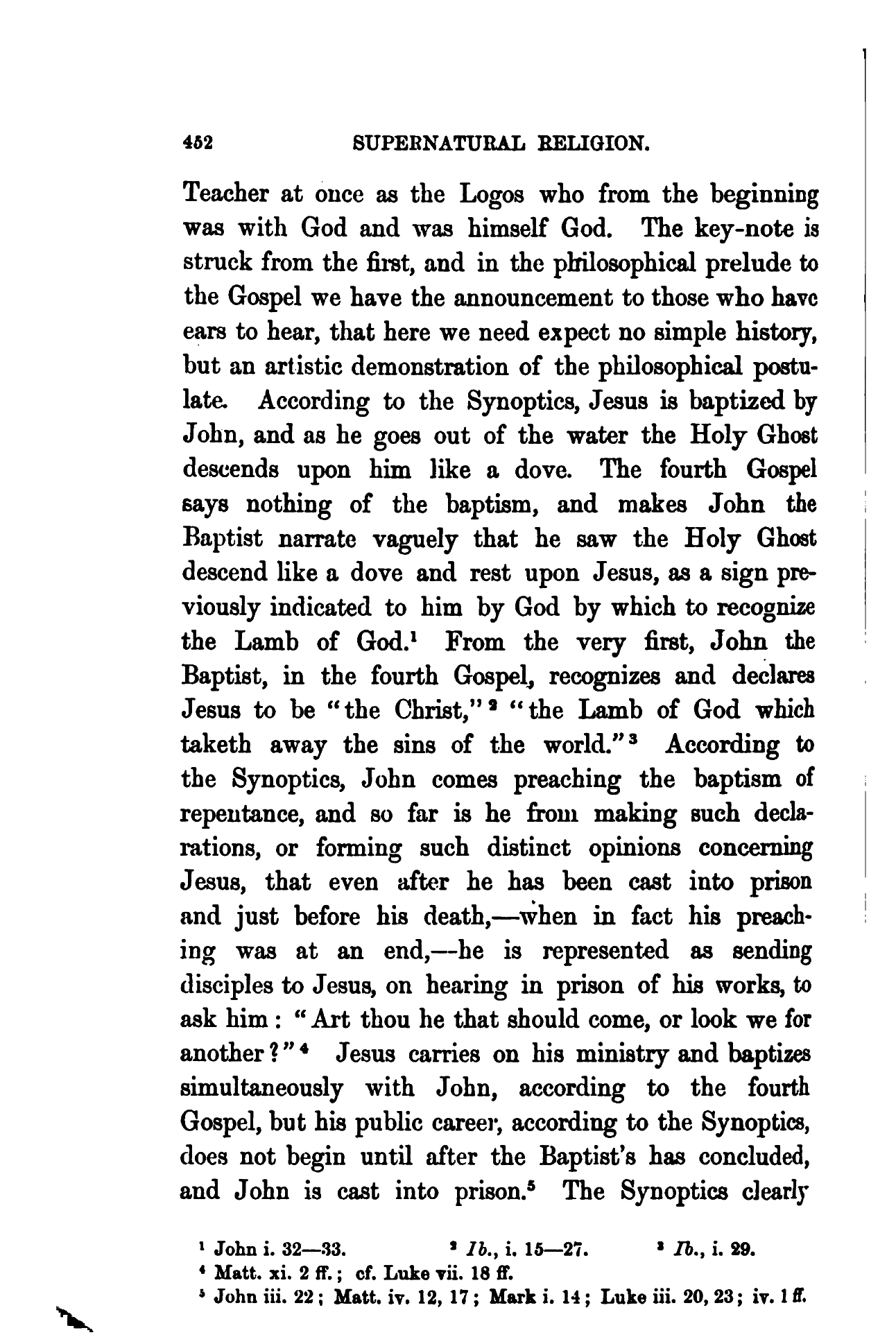 Teacher at once as the Logos who from the beginning was with God and was himself God. The key-note is struck from the first, and in the philosophical prelude to the Gospel we have the announcement to those who have ears to hear, that here we need expect no simple history, but an artistic demonstration of the philosophical postulate. According to the Synoptics, Jesus is baptized by John, and as he goes out of the water the Holy Ghost descends upon him like a dove. The fourth Gospel says nothing of the baptism, and makes John the Baptist narrate vaguely that he saw the Holy Ghost descend like a dove and rest upon Jesus, as a sign previously indicated to him by God by which to recognize the Lamb of God.(1) From the very first, John the Baptist, in the fourth Gospel, recognizes and declares Jesus to be "the Christ,"(2) "the Lamb of God which taketh away the sins of the world."(3) According to the Synoptics, John comes preaching the baptism of repentance, and so far is he from making such declarations, or forming such distinct opinions concerning Jesus, that even after he has been cast into prison and just before his death,—when in fact his preaching was at an end,—he is represented as sending disciples to Jesus, on hearing in prison of his works, to ask him: "Art thou he that should come, or look we for another?" (4) Jesus carries on his ministry and baptizes simultaneously with John, according to the fourth Gospel, but his public career, according to the Synoptics, does not begin until after the Baptist's has concluded, and John is cast into prison.(5) The Synoptics clearly