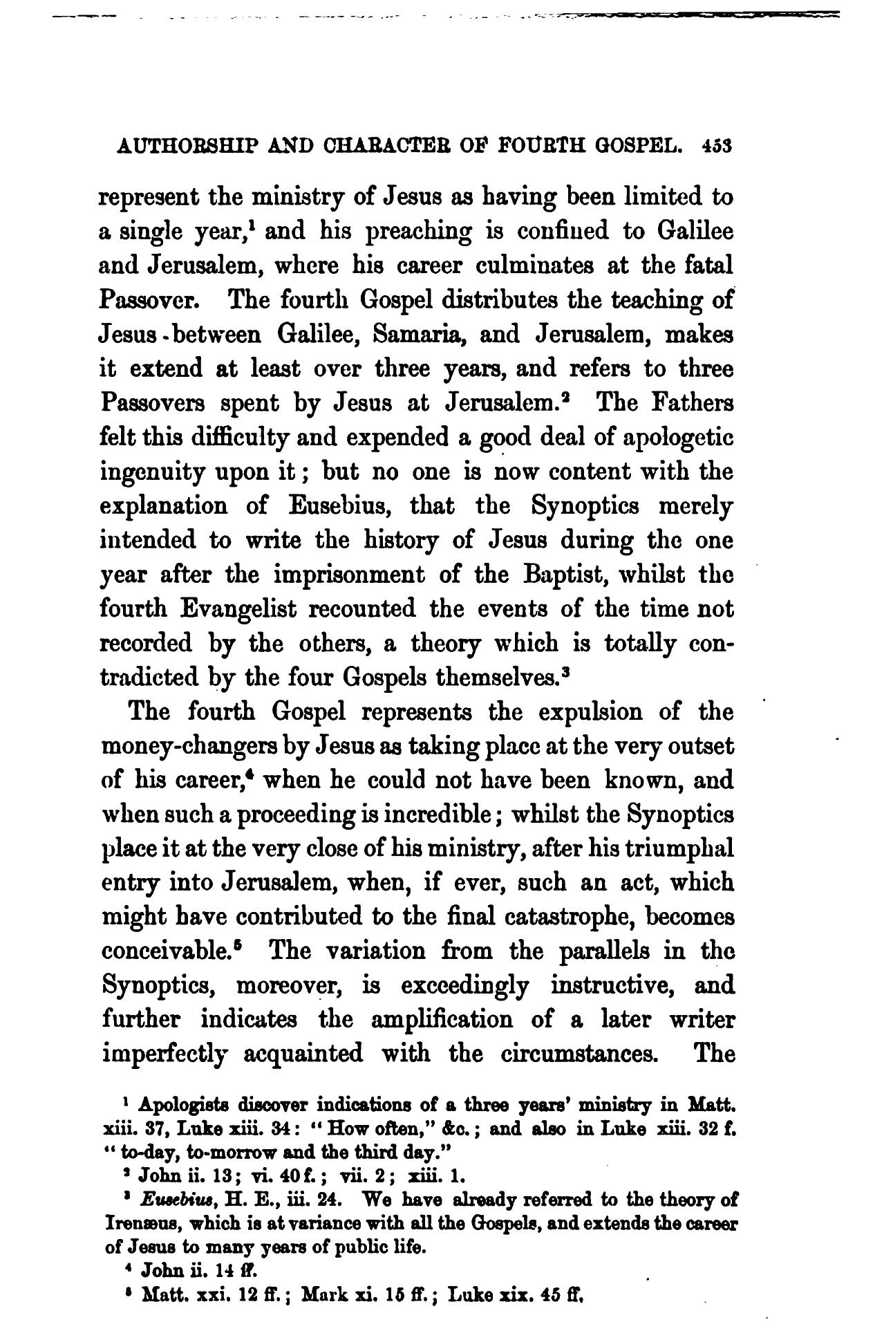 represent the ministry of Jesus as having been limited to a single year,(1) and his preaching is confined to Galilee and Jerusalem, where his career culminates at the fatal Passover. The fourth Gospel distributes the teaching of Jesus-between Galilee, Samaria, and Jerusalem, makes it extend at least over three years, and refers to three Passovers spent by Jesus at Jerusalem.(2) The Fathers felt this difficulty and expended a good deal of apologetic ingenuity upon it; but no one is now content with the explanation of Eusebius, that the Synoptics merely intended to write the history of Jesus during the one year after the imprisonment of the Baptist, whilst the fourth Evangelist recounted the events of the time not recorded by the others, a theory which is totally contradicted by the four Gospels themselves.(3)
