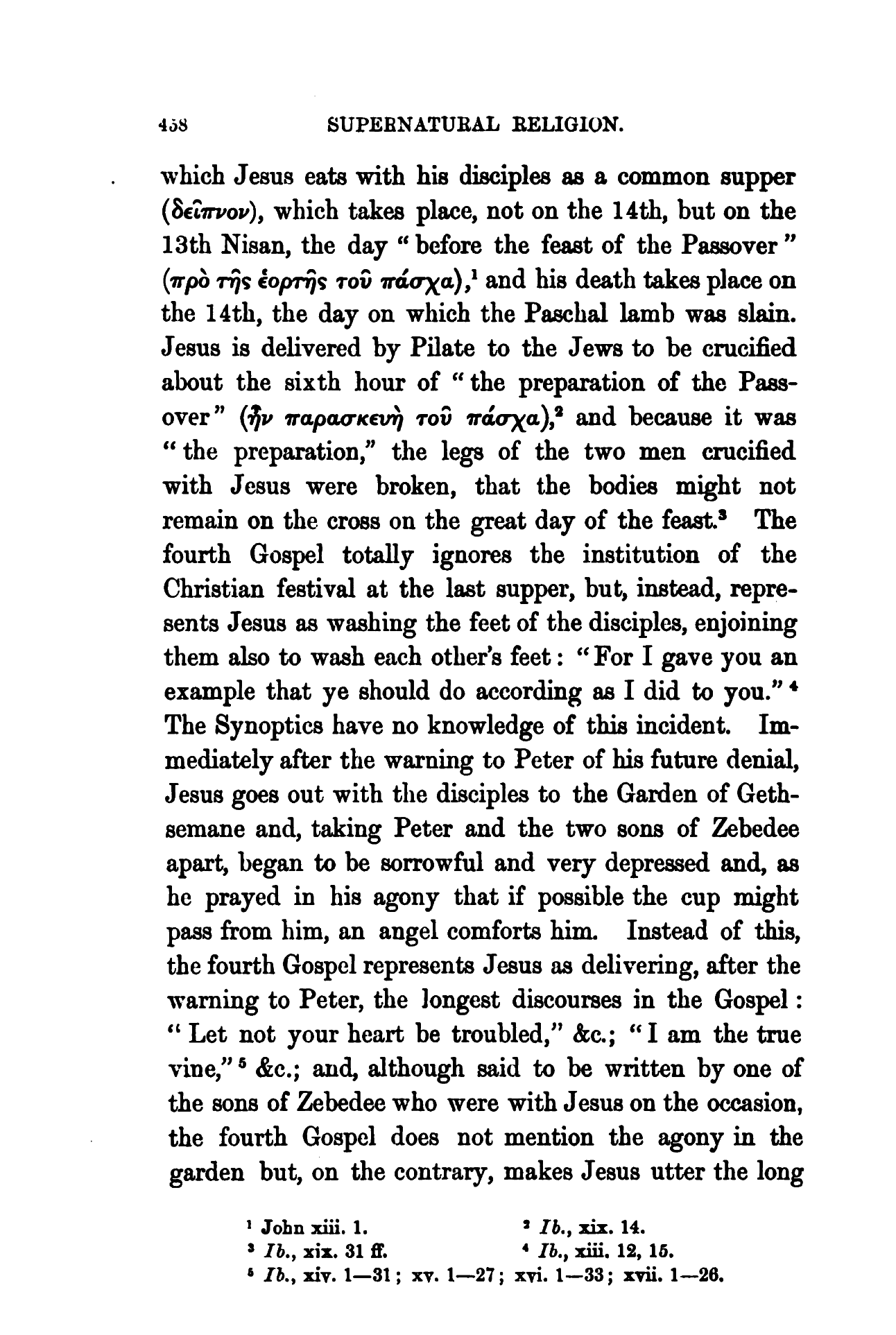 The Synoptics represent most clearly that Jesus on the evening of the 14th Nisan, after the custom of the Jews, ate the Passover with his disciples,(4) and that he was arrested in the first hours of the 15th Nisan, the day on which he was put to death. Nothing can be more distinct than the statement that the last supper was the Paschal feast. "They made ready the Passover [———], and when the hour was come, he sat down and the apostles with him, and he said to them: With desire I desired to eat this Passover with you before I suffer" [———].(5) The fourth Gospel, however, in accordance with the principle which is dominant throughout, represents the last repast