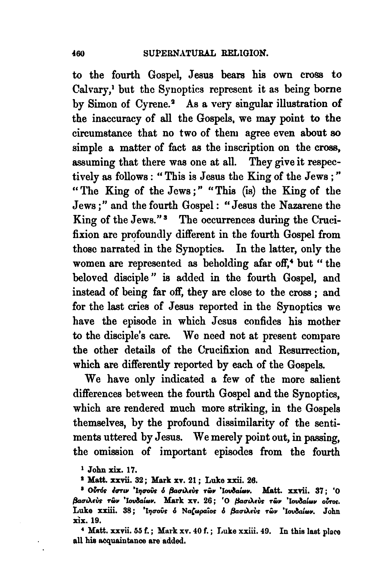 to the fourth Gospel, Jesus bears his own cross to Calvary,(1) but the Synoptics represent it as being borne by Simon of Cyrene.(2) As a very singular illustration of the inaccuracy of all the Gospels, we may point to the circumstance that no two of them agree even about so simple a matter of fact as the inscription on the cross, assuming that there was one at all. They give it respectively as follows: "This is Jesus the King of the Jews;" "The King of the Jews;" "This (is) the King of the Jews;" and the fourth Gospel: "Jesus the Nazarene the King of the Jews."(3) The occurrences during the Crucifixion are profoundly different in the fourth Gospel from those narrated in the Synoptics. In the latter, only the women are represented as beholding afar off,(4) but "the beloved disciple" is added in the fourth Gospel, and instead of being far off, they are close to the cross; and for the last cries of Jesus reported in the Synoptics we have the episode in which Jesus confides his mother to the disciple's care. We need not at present compare the other details of the Crucifixion and Resurrection, which are differently reported by each of the Gospels.