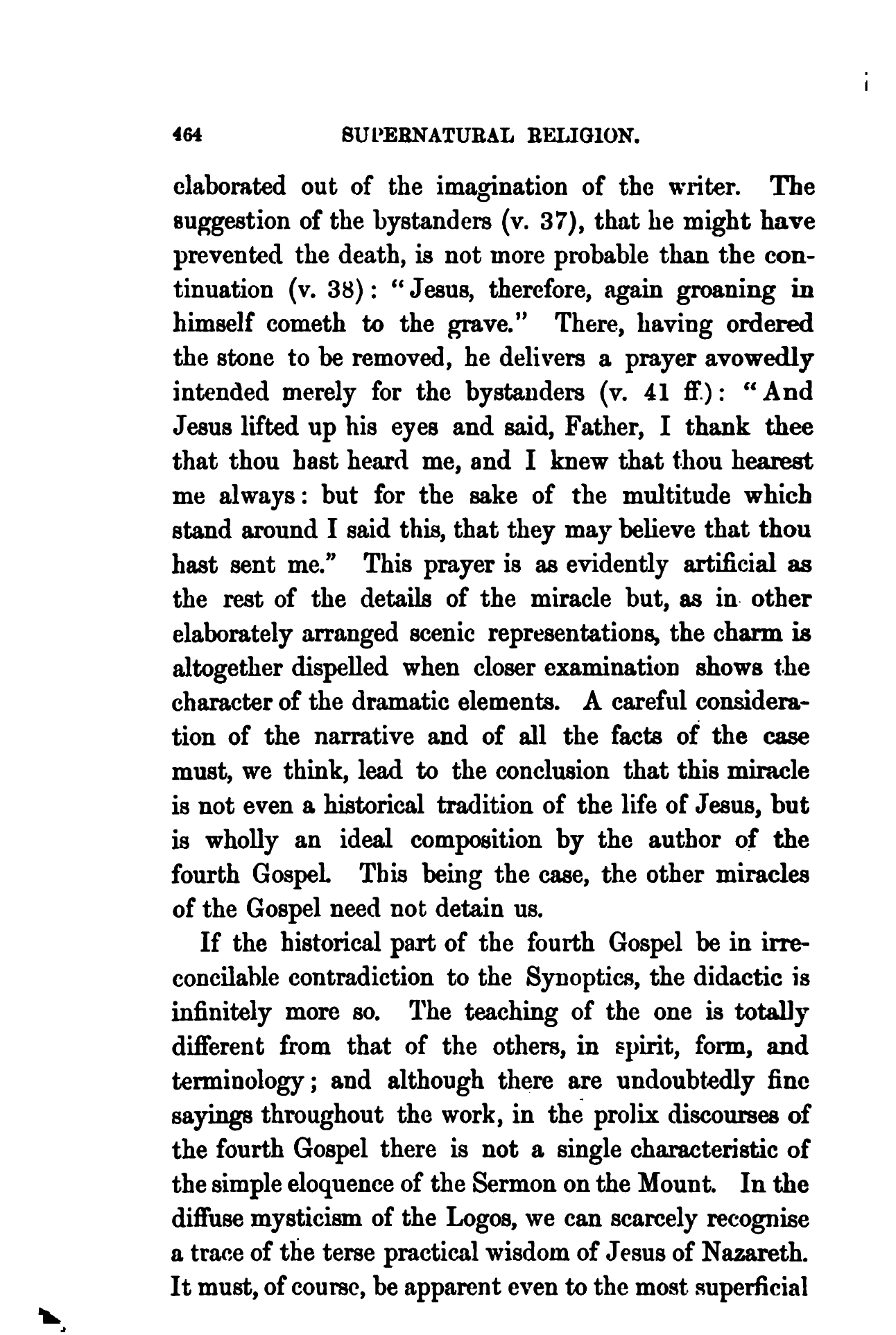 elaborated out of the imagination of the writer. The suggestion of the bystanders (v. 37), that he might have prevented the death, is not more probable than the continuation (v. 38): "Jesus, therefore, again groaning in himself cometh to the grave." There, having ordered the stone to be removed, he delivers a prayer avowedly intended merely for the bystanders (v. 41 ff): "And Jesus lifted up his eyes and said, Father, I thank thee that thou hast heard me, and I knew that thou hearest me always: but for the sake of the multitude which stand around I said this, that they may believe that thou hast sent me." This prayer is as evidently artificial as the rest of the details of the miracle but, as in other elaborately arranged scenic representations, the charm is altogether dispelled when closer examination shows the character of the dramatic elements. A careful consideration of the narrative and of all the facts of the case must, we think, lead to the conclusion that this miracle is not even a historical tradition of the life of Jesus, but is wholly an ideal composition by the author of the fourth Gospel. This being the case, the other miracles of the Gospel need not detain us.