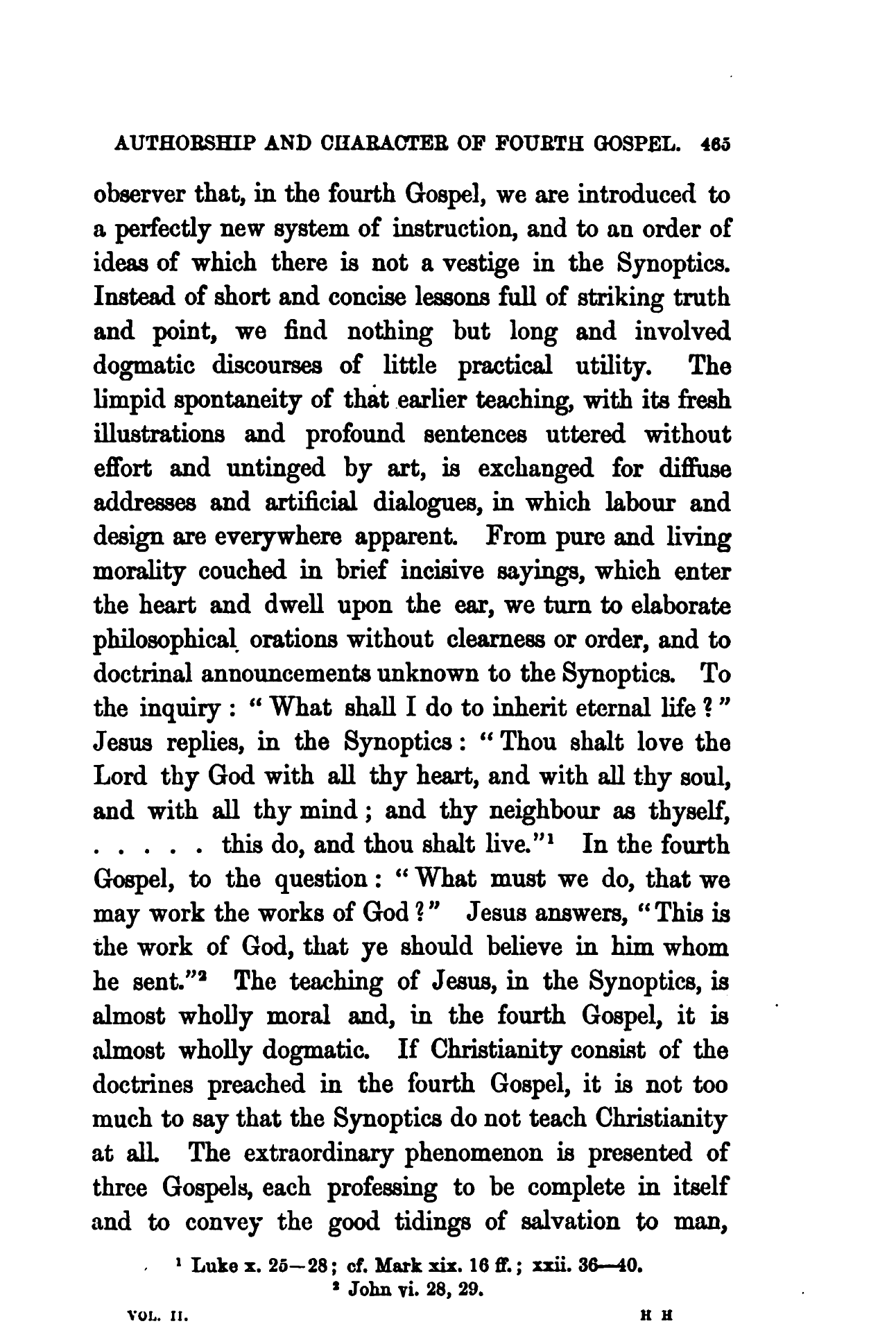 observer that, in the fourth Gospel, we are introduced to a perfectly new system of instruction, and to an order of ideas of which there is not a vestige in the Synoptics. Instead of short and concise lessons full of striking truth and point, we find nothing but long and involved dogmatic discourses of little practical utility. The limpid spontaneity of that earlier teaching, with its fresh illustrations and profound sentences uttered without effort and untinged by art, is exchanged for diffuse addresses and artificial dialogues, in which labour and design are everywhere apparent. From pure and living morality couched in brief incisive sayings, which enter the heart and dwell upon the ear, we turn to elaborate philosophical orations without clearness or order, and to doctrinal announcements unknown to the Synoptics. To the inquiry: "What shall I do to inherit eternal life?" Jesus replies, in the Synoptics: "Thou shalt love the Lord thy God with all thy heart, and with all thy soul, and with all thy mind; and thy neighbour as thyself,... this do, and thou shalt live."(1) In the fourth Gospel, to the question: "What must we do, that we may work the works of God?" Jesus answers, "This is the work of God, that ye should believe in him whom he sent."(2) The teaching of Jesus, in the Synoptics, is almost wholly moral and, in the fourth Gospel, it is almost wholly dogmatic. If Christianity consist of the doctrines preached in the fourth Gospel, it is not too much to say that the Synoptics do not teach Christianity at all. The extraordinary phenomenon is presented of three Gospels, each professing to be complete in itself and to convey the good tidings of salvation to man,