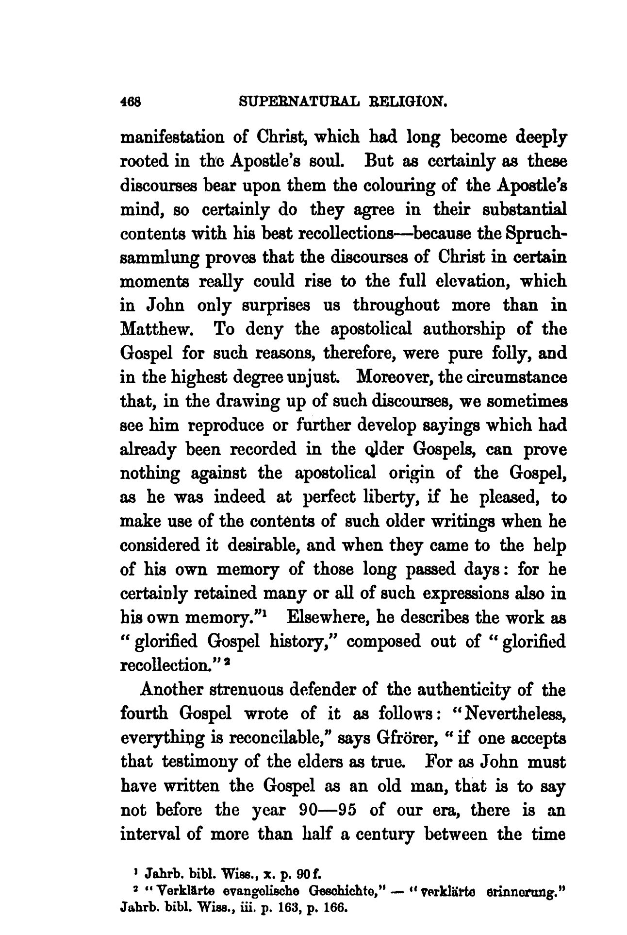 manifestation of Christ, which had long become deeply rooted in the Apostle's soul. But as certainly as these discourses bear upon them the colouring of the Apostle's mind, so certainly do they agree in their substantial contents with his best recollections—because the Spruchsammlung proves that the discourses of Christ in certain moments really could rise to the full elevation, which in John only surprises us throughout more than in Matthew. To deny the apostolical authorship of the Gospel for such reasons, therefore, were pure folly, and in the highest degree unjust. Moreover, the circumstance that, in the drawing up of such discourses, we sometimes see him reproduce or further develop sayings which had already been recorded in the older Gospels, can prove nothing against the apostolical origin of the Gospel, as he was indeed at perfect liberty, if he pleased, to make use of the contents of such older writings when he considered it desirable, and when they came to the help of his own memory of those long passed days: for he certainly retained many or all of such expressions also in his own memory."(1) Elsewhere, he describes the work as "glorified Gospel history," composed out of "glorified recollection."(2)