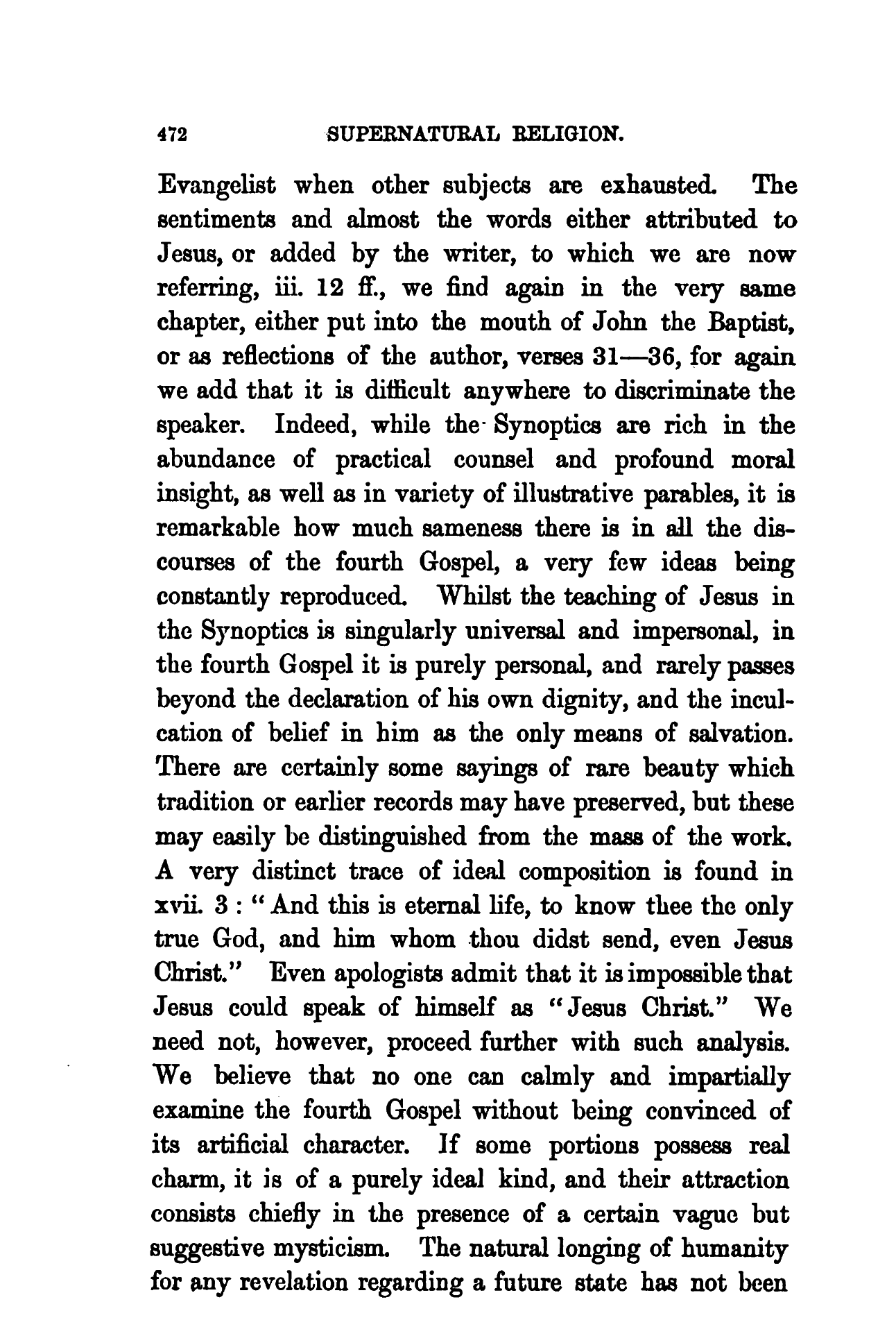 Evangelist when other subjects are exhausted. The sentiments and almost the words either attributed to Jesus, or added by the writer, to which we are now referring, iii. 12 ff., we find again in the very same chapter, either put into the mouth of John the Baptist, or as reflections of the author, verses 31—36, for again we add that it is difficult anywhere to discriminate the speaker. Indeed, while the Synoptics are rich in the abundance of practical counsel and profound moral insight, as well as in variety of illustrative parables, it is remarkable how much sameness there is in all the discourses of the fourth Gospel, a very few ideas being constantly reproduced. Whilst the teaching of Jesus in the Synoptics is singularly universal and impersonal, in the fourth Gospel it is purely personal, and rarely passes beyond the declaration of his own dignity, and the inculcation of belief in him as the only means of salvation. There are certainly some sayings of rare beauty which tradition or earlier records may have preserved, but these may easily be distinguished from the mass of the work. A very distinct trace of ideal composition is found in xvii. 3: "And this is eternal life, to know thee the only true God, and him whom thou didst send, even Jesus Christ." Even apologists admit that it is impossible that Jesus could speak of himself as "Jesus Christ." We need not, however, proceed further with such analysis. We believe that no one can calmly and impartially examine the fourth Gospel without being convinced of its artificial character. If some portions possess real charm, it is of a purely ideal kind, and their attraction consists chiefly in the presence of a certain vague but suggestive mysticism. The natural longing of humanity for any revelation regarding a future state has not been