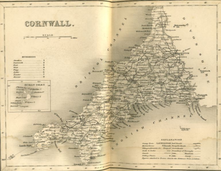 [A] BERRY POMEROY. This place, situated in the hundred of Hayter, derives its name from the Pomeroys, a very considerable family in these parts. Ralph de Pomeroy, who came to England with William the Norman, and for his services was rewarded with fifty-eight lordships in this county, built a castle here, the magnificent ruins of which, seated on Castle in ruins. a rocky eminence, rising over a pellucid brook, now form, in combination with the other features of the scenery, one of the most delightful views in Devonshire. The approach to the castle, observes Dr. Matton, in his Observations on the Western Counties, "is through a thick wood, extending along the slope of a range of hills that entirely intercept any prospect to the south: on the opposite side is a steep rocky ridge, covered with oak, so that the ruins are shut into a beautiful valley. The great gate, with the walls of the south front, the north wing of the court, or quadrangle, some apartments on the west side, and a turret or two, are the principal remains of the building; and these are so finely overhung with the branches of trees and shrubs which grow close to the walls, so beautifully mantled with ivy, and so richly incrusted with moss, that they constitute the most picturesque objects that can be imagined; and when the surrounding scenery is taken into the account, the noble mass of wood fronting the gate, the bold ridges rising in the horizon, and the fertile valley opening to the east, the ruins of Berry Pomeroy Castle must be considered as almost unparalleled in their effect." The posterity of Ralph de Pomeroy resided here till the reign of Edward VI., when Sir Thomas Pomeroy sold the manor to Edward Seymour, Duke of Somerset, from whom it has descended to the present Duke of Somerset. Berry Pomeroy Castle, whose venerable ruins we have just mentioned, appears to have been originally quadrangular, and to have had but one entrance, which was on the south side, between two hexagonal towers, through a double gateway; the first of which was machiolated, and strengthened by angular bastions, and having over it the Pomeroy arms, still visible. A small room over the gateway was probably the chapel: it is divided by a wall, supported by pillars and arches. From the eastern tower is a fine view of the surrounding country. The ruins in the interior part, or quadrangle, are considerably more modern than the rest of the building. These appear to have belonged to a "magnificent structure," commenced, says Prince, in his Worthies of Devonshire, by the Seymours, at an expense of Former state of the castle. £20,000, but "never brought to perfection: for the west side of the mansion was never begun: what was finished may be thus described. Before the door of the Great Hall was a noble walk whose length was the breadth of the court, arched over with curiously carved free-stone, supported in the fore part by several stately pillars of the same stone, of great dimensions, after the Corinthian order, standing on pedestals, having cornices and freezes finely wrought. The apartments within were very splendid, especially the dining-room; and many other of the rooms were well adorned with mouldings and fret-work; some of whose marble clavils were so delicately fine, that they would reflect an object true and lively from a great distance. Notwithstanding which it is now demolished, and all this glory lyeth in the dust, buried in its own ruins; there being nothing standing but a few broken walls, which seem to mourn their own approaching funerals." The walls are formed of slate, and appear to be rapidly decaying. The grounds round the castle consist of steep eminences, covered with oak and other trees. Even in the court, and remains of the fortress itself, trees of nearly a century's growth are flourishing in luxuriance, and compose, with the shrubs thickly scattered within the area, a scene highly beautiful. In the wars between Charles I. and the Parliament this castle was dismantled. Berry Pomeroy Church, which was built by one of the Pomeroy family, contains a splendid alabaster monument to the memory of Lord Edward Seymour, Knt. son to the Duke of Somerset; Edward Seymour, Bart. and his Lady, the daughter of Sir Arthur Champernoune. The two first are represented in armour; the knight having a truncheon in his hand, and lying cross-legged. The lady is in a black dress, with the figure of a child, in a cradle, at her head, and at her feet another in a chair: below are nine figures kneeling, with books open before them. This monument was repaired by the late Duke of Somerset, the eighth lineal descendant of the Duke of Somerset the Protector.