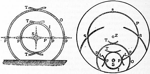 The phenomenon of a solar (or lunar) halo as seen from the earth is represented in fig. 1; fig. 2 is a diagrammatic sketch showing the appearance as viewed from the zenith; but it is only in exceptional circumstances that all the parts are seen. Encircling the sun or moon (S), there are two circles, known as the inner halo I, and the outer halo O, having radii of about 22° and 46°, and exhibiting the colours of the spectrum in a confused manner, the only decided tint being the red on the inside. Passing through the luminary and parallel to the horizon, there is a white luminous circle, the parhelic circle (P), on which a number of images of the luminary appear. The most brilliant are situated at the intersections of the inner halo and the parhelic circle; these are known as parhelia (denoted by the letter p in the figures) (from the Gr. παρά, beside, and ἥλιος, the sun) or “mock-suns,” in the case of the sun, and as paraselenae (from παρά and σελήνη, the moon) or “mock-moons,” in the case of the moon. Less brilliant are the parhelia of the outer halo. The parhelia are most brilliant when the sun is near the horizon. As the sun rises, they pass a little beyond the halo and exhibit flaming tails. The other images on the parhelic circle are the paranthelia (q) and the anthelion (a) (from the Greek ἀντί, opposite, and ἥλιος, the sun). The former are situated at from 90° to 140° from the sun; the latter is a white patch of light situated at the anti-solar point and often exceeding in size the apparent diameter of the luminary. A vertical circle passing through the sun may also be seen. From the parhelia of the inner halo two oblique curves (L) proceed. These are known as the “arcs of Lowitz,” having been first described in 1794 by Johann Tobias Lowitz (1757-1804). Luminous arcs (T), tangential to the upper and lower parts of each halo, also occur, and in the case of the inner halo, the arcs may be prolonged to form a quasi-elliptic halo.