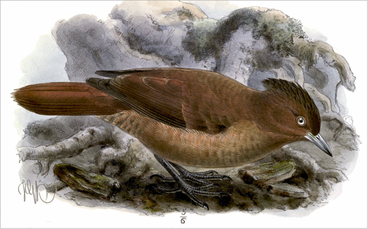 The Pteroptochidæ form a small but very peculiar family of Tracheophonine Passeres, mostly restricted to Chili and the south-western extremity of the South-American Continent, but also represented in the Andes of Ecuador and Colombia and in the high plateau of Central Brazil. They are ground-birds, remarkable for their large and robust feet with long claws, their strangely formed bills, and the elevated position in which the tail is carried in the living bird.