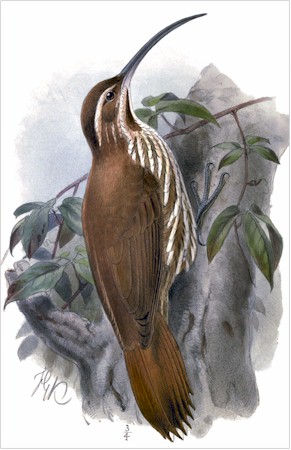 Eyton, when he described this species from Bridges’s specimens, gave its habitat as Bolivia. It may inhabit the southern part of that Republic, but it is more probable that Bridges’s examples were obtained in Northern Argentina, which he likewise visited. Bridges’s Wood-hewer is the only member of its genus, and is one of the largest of the whole family Dendrocolaptidæ, measuring some 13 or 14 inches in length, inclusive of the great curved beak. Although found throughout the northern portion of the Argentine Republic, its habits are as yet imperfectly known, but the following extracts show that they must be very interesting, and that the bird is remarkably versatile. Mr. Barrows writes:—“These birds are somewhat gregarious, being oftenest seen in small parties of six to ten. They sometimes cling against the bark of a tree in the manner of Woodpeckers, but also spend much of their time on the ground. I think they use their curved bill much oftener for probing in the ground than for searching the bark of trees, as many of those shot had the base of the bill and the frontal feathers plastered with mud. In the stomach of the first one killed I found the silken sac, three fourths of an inch in diameter, or the eggs of a large spider, which makes holes ten or twelve inches deep in the hard soil everywhere.”