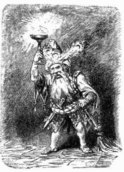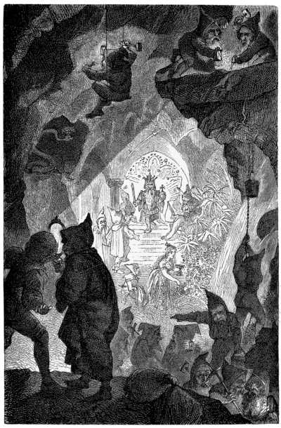 Below there was rattling of dishes and the patter of many feet; the young couple heard every sound through the wide chimney. The strong voice of the rock giant sounded like thunder to human ears, and the voice of the lady, which Orm and Aslog had heard once before, was like the powerful notes of some musical instrument.270 Tables and chairs were moved, drinking-horns were knocked together; the feast was beginning, and now was heard once more that music which had before so overwhelmed Aslog with delight. Then an irresistible longing seized her to see the wondrous company which Orm had described to her. She rose and groped for a crack in the floor through which it was possible to see into the room below. Orm in silence held out his hand to check her fatal rashness, but the movement woke the sleeping babe, who, terrified by the unwonted sounds below, raised a cry that went to the mother's heart. Forgetting everything now but her child's distress, she began, as was her wont, to soothe him with caressing words. Then suddenly an awful cry and a wild tumult arose below, the music ceased, and through the door rushed the dwarfs in wild commotion. Their torches went out, the noise of their flight sounded but a few moments, then night and silence reigned over the place which a minute before had resounded with festive merriment.