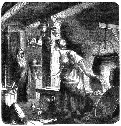 When they awoke the sun was shining brightly outside, but its beams could fall but dimly through the rude window-panes. The doors were firmly fastened, and there was no trace of human footsteps, yet the fire burned once more on the hearth, from the bubbling cauldron rose a tempting fragrance, and the table was laid as for a meal.