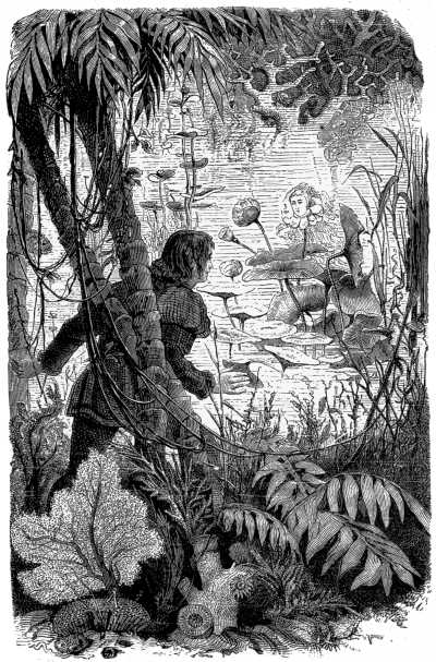 The blossoming fruit-trees bore evidence of some careful hand, but no path, no footprint told of the cheering nearness of human beings. They went on further through the green island, over which the sun was shedding its last golden beams. There before them they saw a clear space amid the foliage, and with hearts beating with hope and fear they approached it. Soon they stood before a house of very ancient architecture. Its walls sank deep into the earth, and towered so high into the air that the firs could scarcely stretch their dark branches over the hide-covered roof. The windows were small, and their panes made of fishes' skins. The door264 was made of strong planks, and firmly bound with iron. The whole house looked as if it bade defiance to the storms, and had done so for centuries.