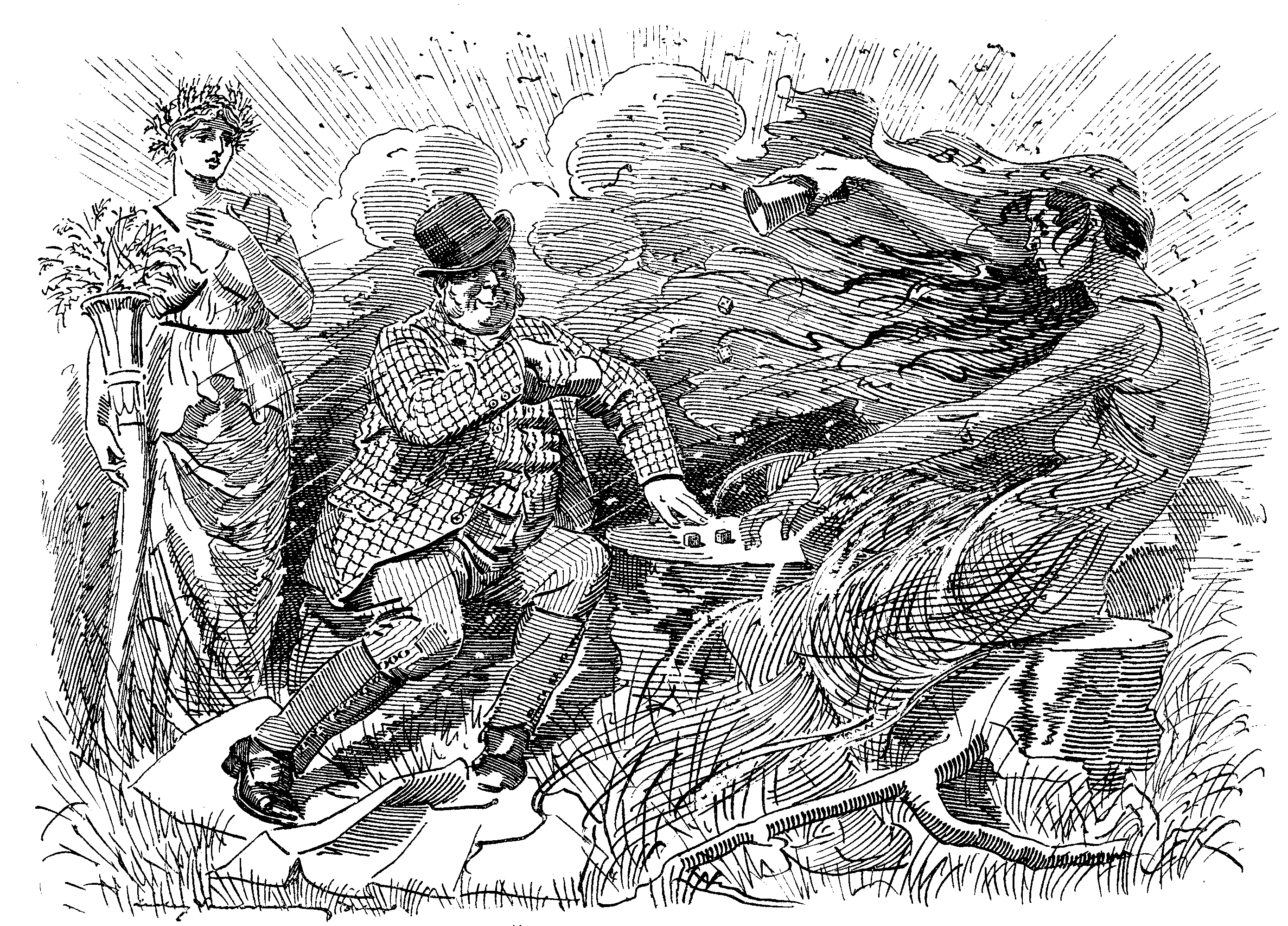 Friday.—Temple going about much as if on Tuesday night he had got out of his cab in the ordinary fashion. He didn't, you know. Taken out in sections through the upper window by couple of stalwart policemen. This owing to circumstance that Irish cab-driver having, after fashion of his country, saved a trot for the avenue, dashed up against kerbstone and overturned cab.
